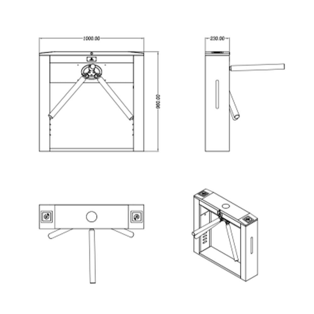 Напівавтоматичний турнікет-трипод; пропускна здатність: 30-35 чол/хв; ширина проходу: 550 мм; тип конструкції: рожковий; тип встановлення: підлогове; тип турнікета: напівзростовий; час відчіненя: 0.2 с; живлення: АС100-240В, 50/60 Гц; споживання: 24 Вт; індикатор: світодіодний; встановлення: внутрішнє; матеріал: нержавіюча сталь; розміри: 1000 / 230 / 960 мм