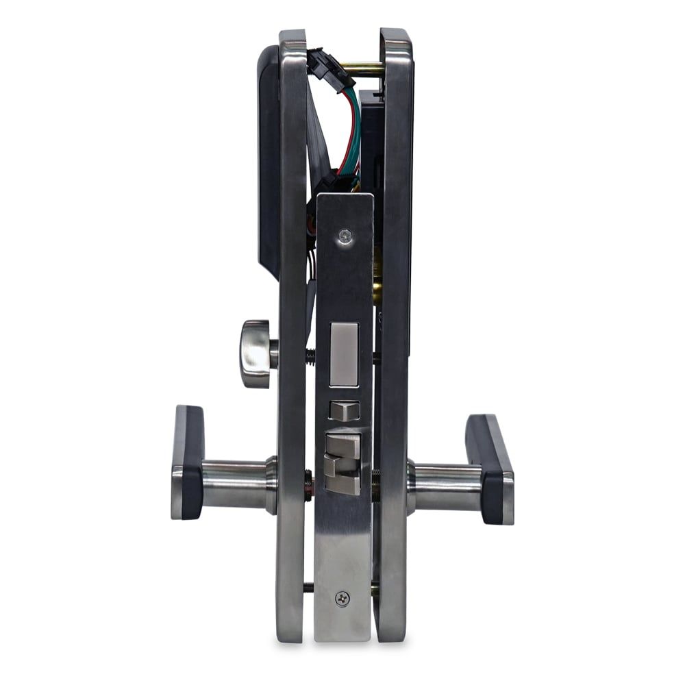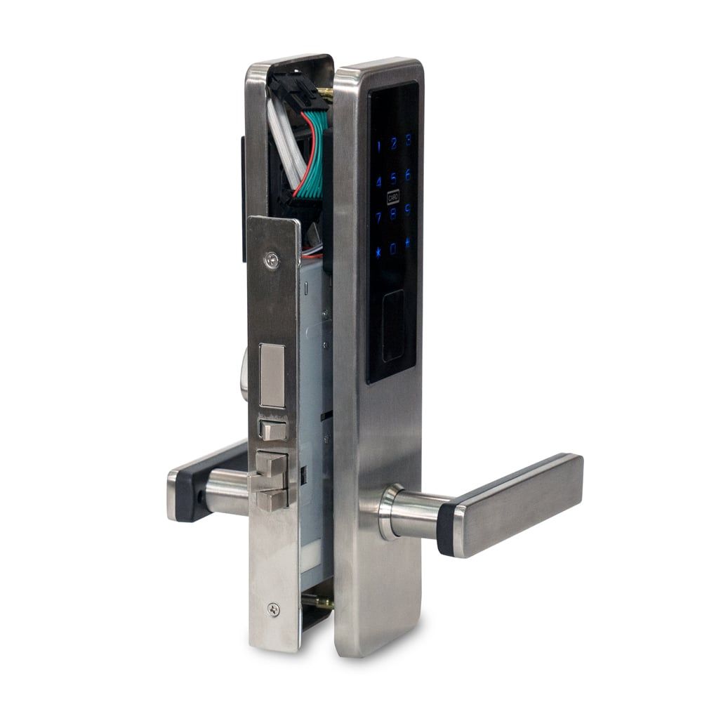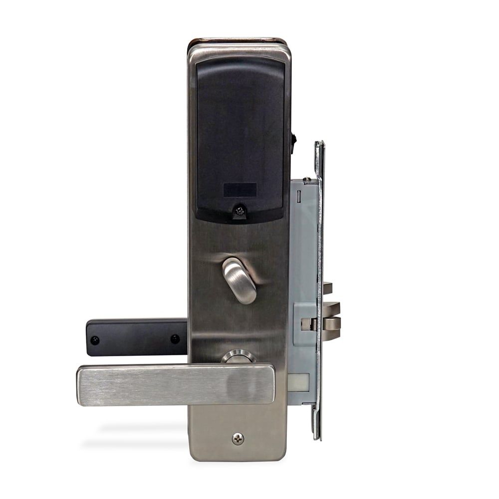 Автономний електромеханічний замок з Bluetooth і зчитувачем Mifare 13.56 МГц; відімкнення за допомогою: коду, картки, застосунку, ключа; кількість користувачів за карткою / кодом 200 / 200; роз'єм microUSB; застосунок для роботи TTLock, TTHotel; живлення 4*АА батарейки; матеріал і товщина дверей: металеві/дерев'яні, 40-55 мм; матеріал корпусу нержавіюча сталь; розміри 230 / 90.5 / 26 мм