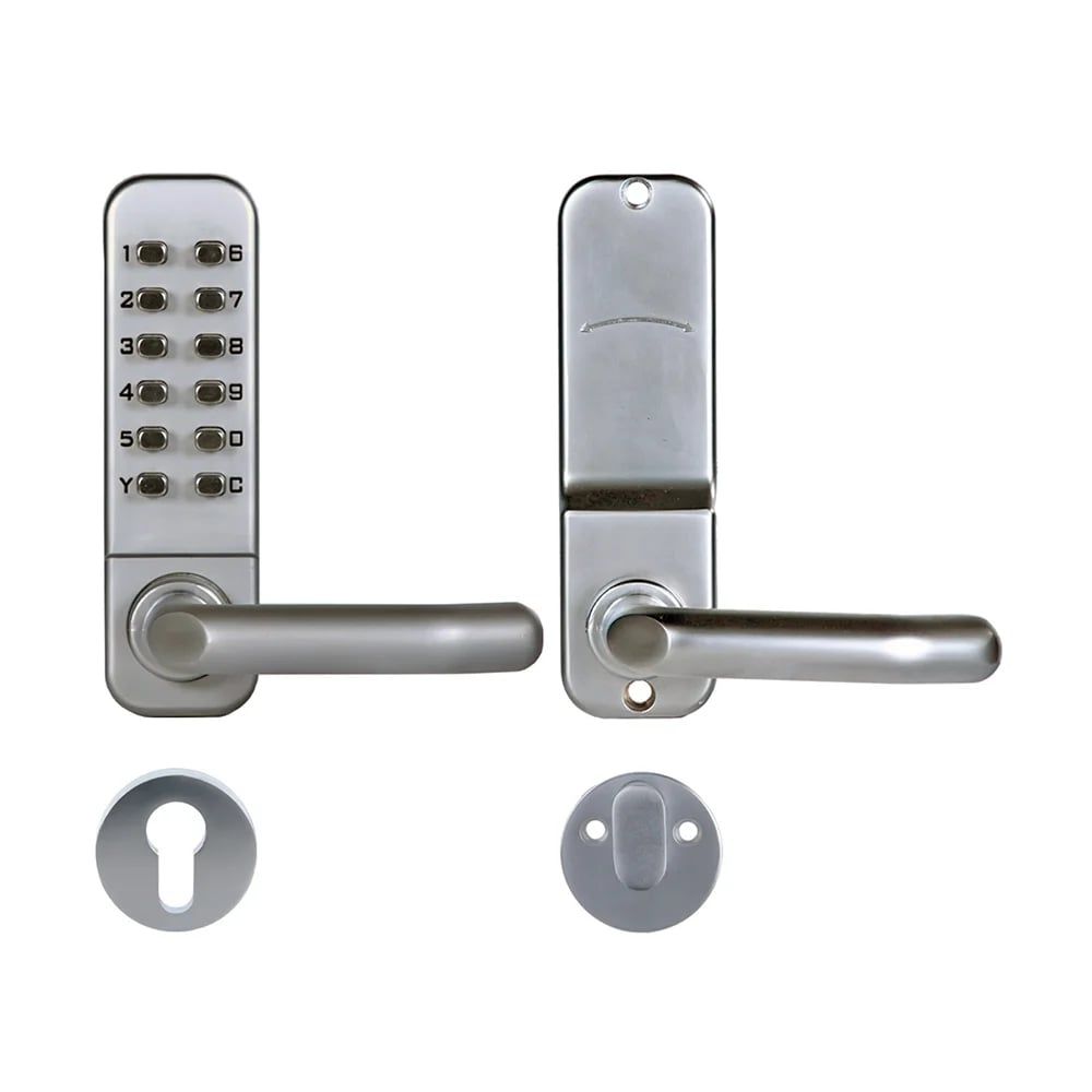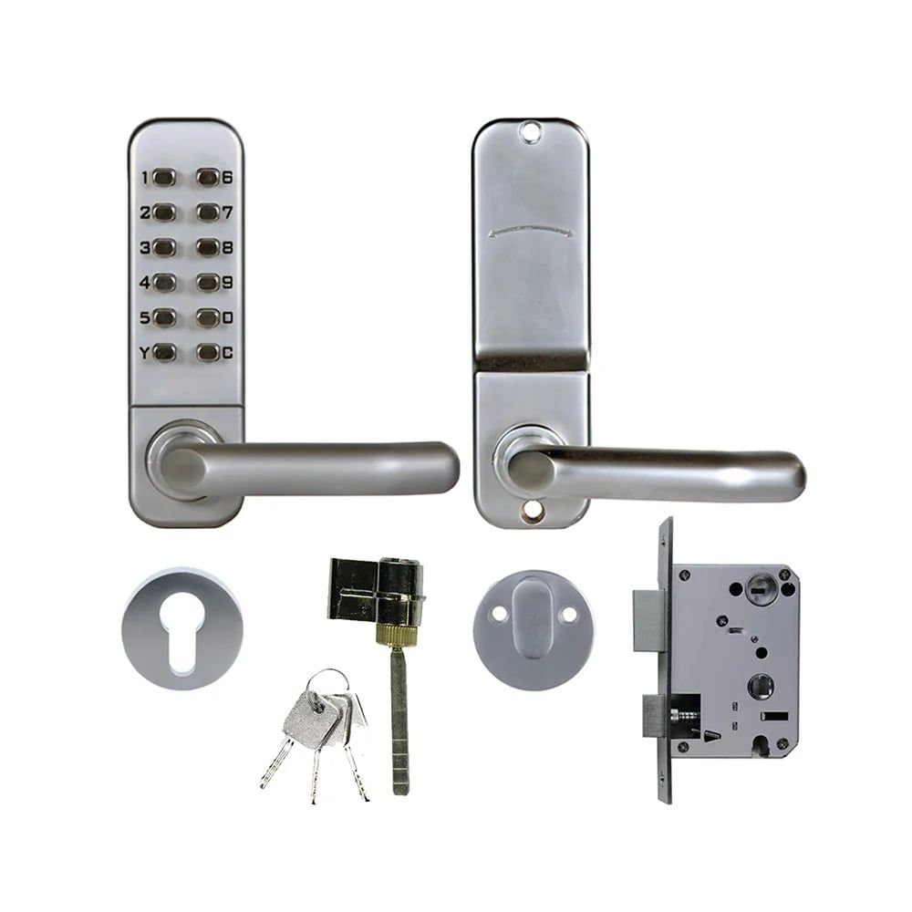 Замок кодовий механічний з ключем; не вимагає живлення; відімкнення за допомогою коду чи ключа; універсальний, для всіх типів дверей; клас захисту IP66; матеріал корпусу сплав цинку; робоча температура від -20°C до +50°C; мортиза 45 / 40 мм у комплекті; розміри 142 / 42 / 25 мм