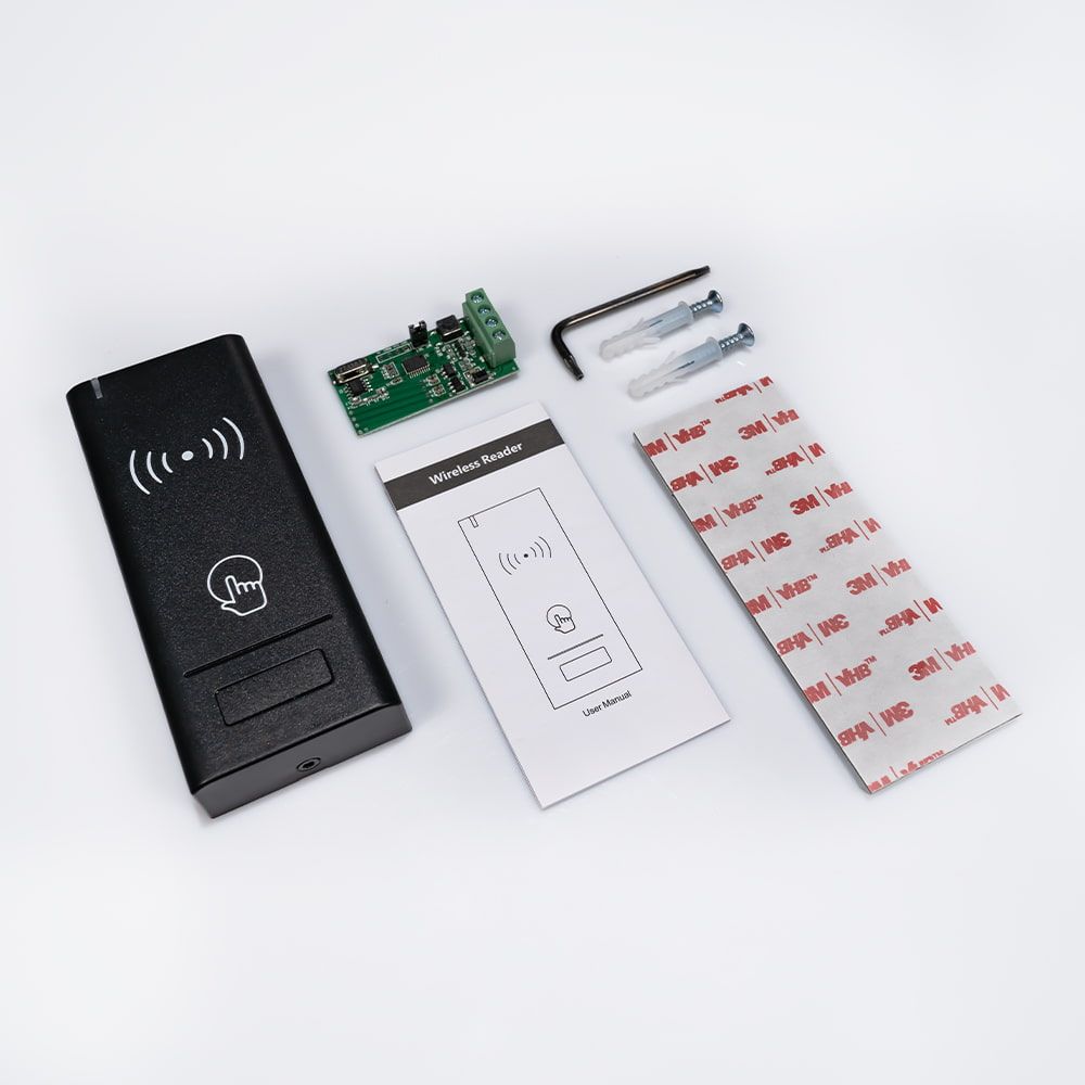 Бездротовий зчитувач з приймачем у комплекті; технологія Rolling Code 433 МГц; тип картки Mifare 13.56 МГц; програмований вихід приймача: Wiegand 26 біт або 34 біт; відстань зв'язку до 30 м; наднизьке енергоспоживання; для внутрішнього встановлення; клас захисту IP54; живлення 3 батарейки ААА; розміри 120 / 50 / 20 мм