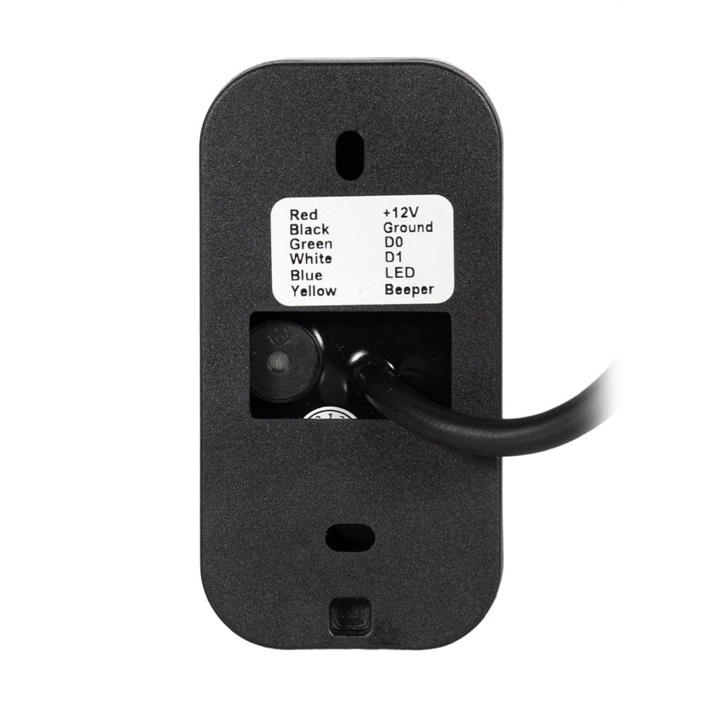 Вуличний водонепроникний зчитувач карток та брелоків стандарту Mifare (13.56MHz); дальність зчитування 2-5 см, швидкість зчитування 0.1 с; інтерфейс Wiegand 26/34; світлова та звукова індикація; живлення 12 В; споживання струму 30 мА; пластиковий корпус; ступінь захисту IP68; робоча температура -45°C~+60°C; розміри 82 / 42 / 18 мм