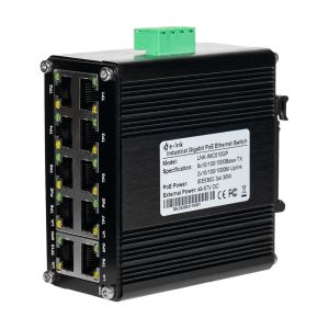 10-портовий промисловий некерований РоE-комутатор з 8-портами PoE 10/100/1000T 802.3at, 2-Port 10/100/1000T RJ45 Uplink; стандарт живлення РоЕ: IEEE802.3at / af, PoE Pin: 4,5 + / 7,8-; загальна потужність <240 Вт; живлення 48-57 В; монтаж на DIN-рейку; клас захисту IP40; робоча температура від -40 до +80 °C; розмір 95 / 88 / 46 мм; вага 300 г