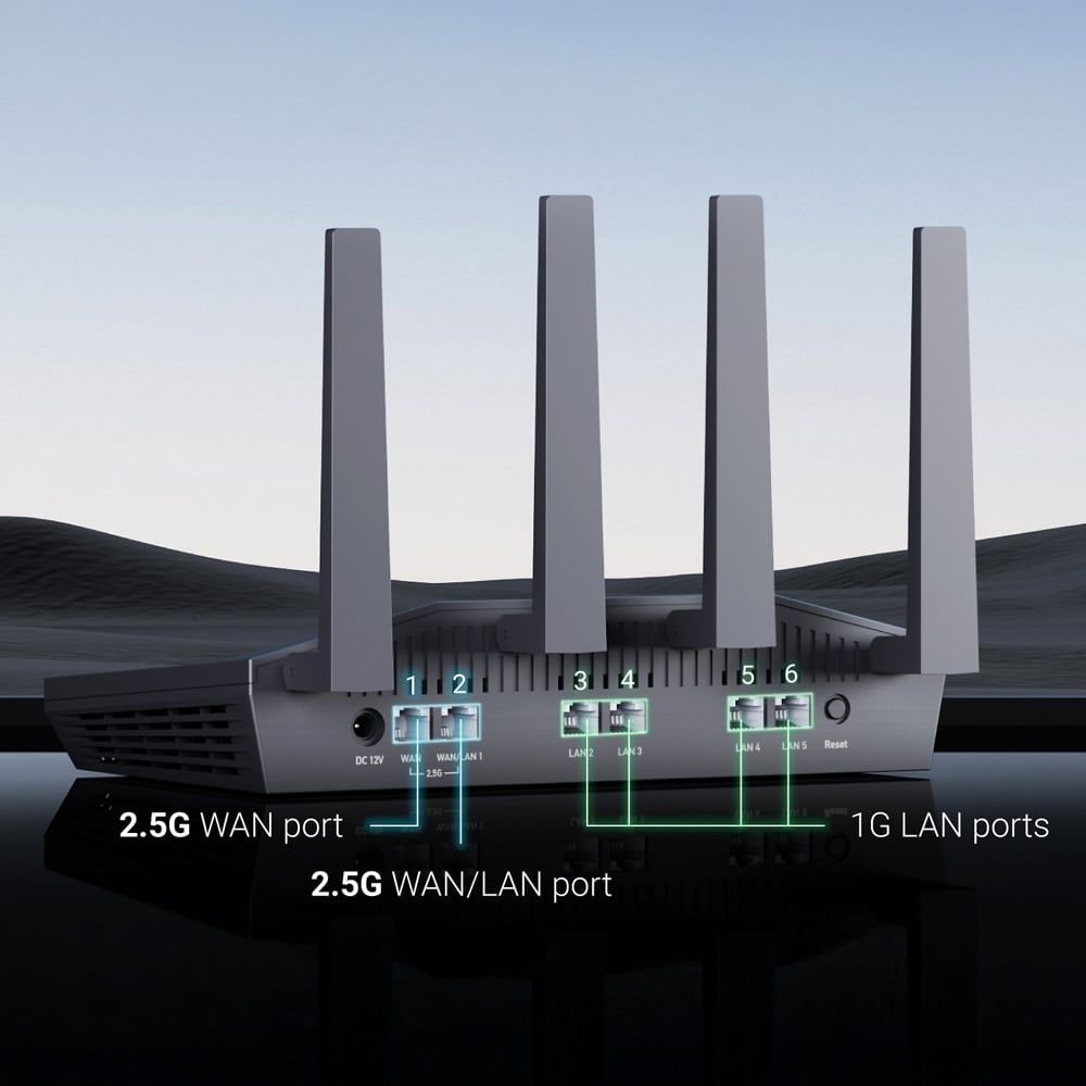 Дводіапазонний WiFi 6 Mesh-маршрутизатор; стандарт Wi-Fi 802.11ax/ac/a/b/g/n; 4804 Мбіт/с на 5 ГГц + 1148 Мбіт/с на 2.4 ГГц; чотириядерний процесор MT7986 2.0 ГГц; пам'ять 1 ГБ DDR4 / 8 ГБ eMMC; ОС OpenWrt (v21.02); 2 порти Ethernet 2.5 Гбіт/с (1 WAN, 1 WAN/LAN ) та 4 гігабітних порти Ethernet LAN; 1 порт USB 3.0 Type-A; 4 зовнішні дводіапазонні антени; режими маршрутизатор / точка доступу / розширювач (Extender) / WDS; MU-MIMO / OFDMA; вбудований AdGuard Home, підтримка WireGuard (до 900 Мбіт/с) та OpenVPN (до 880 Мбіт/с з DCO), шифрований DNS (DoH, DoT); гостьова мережа (Guest SSID); DDNS, IPv4/IPv6; живлення 12 В/4 А, блок живлення у комплекті; робоча температура 0°C~+40°C; розміри 233 / 137 / 53 мм, вага 761 г