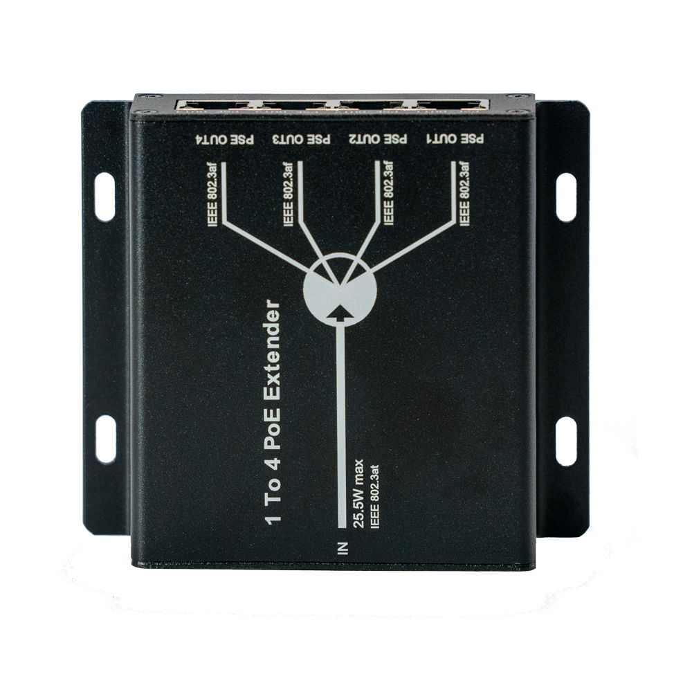 PoE-розширювач-комутатор 4-портовий 10/100M 802.3af/at ; 1 PoE-вхід/4 PoE-виходи; загальна потужність PoE 25.5 Вт; максимальна потужність на 1 порт 15.4 Вт; максимальна довжина кабелю вхід/вихід 120 м; матеріал корпусу метал; ступінь захисту IP40; робоча температура від -20°C до +50°C; розміри 93 / 105 / 28.5 мм; вага 250 г
