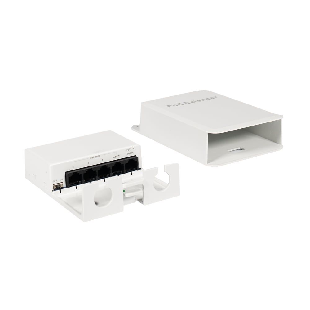PoE-розширювач 4-портовий 10/100M 802.3af/at/bt; 1 PoE-вхід/4 PoE-виходи; потужність вхідного PoE-порту 90 Вт; загальна вихідна потужність PoE 90 Вт, 1-3 порт макс. 30 Вт, 4 порт макс. 60 Вт; при зменшенні потужності на вході зменшиться потужність вихідних портів; максимальна дальність передачі 100 м, в режимі VLAN 250 м (10 Мбіт/с); мережеві стандарти IEEE802.3, IEEE802.3u, IEEE802.3x; пропускна здатність 10 Гбіт/с; таблиця MAC-адрес 1K; розпіновка контактів PoE: 1-3 порти 1,2 (+) / 3,6 (-), 4 порт 1,2 (+) / 3,6 (-) і 4,5 (+) / 7,8 (-); робоча температура від -10°C до +55°C; розміри 98 / 148 / 34 мм; вага 160 г