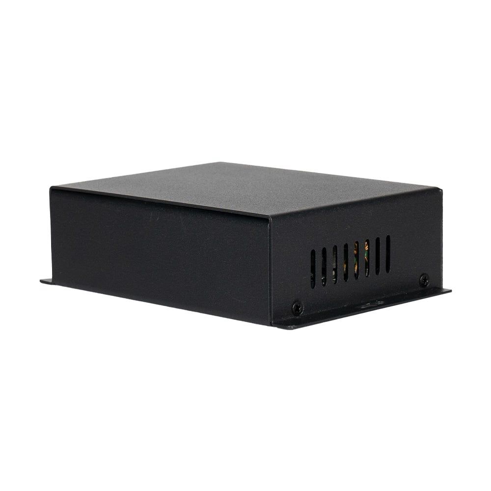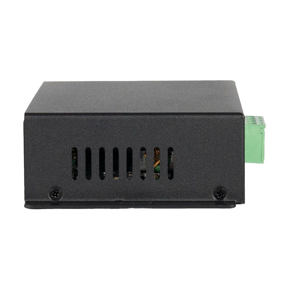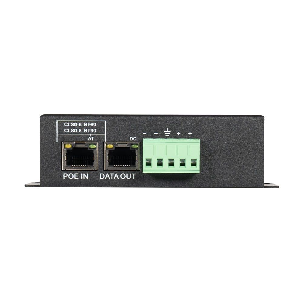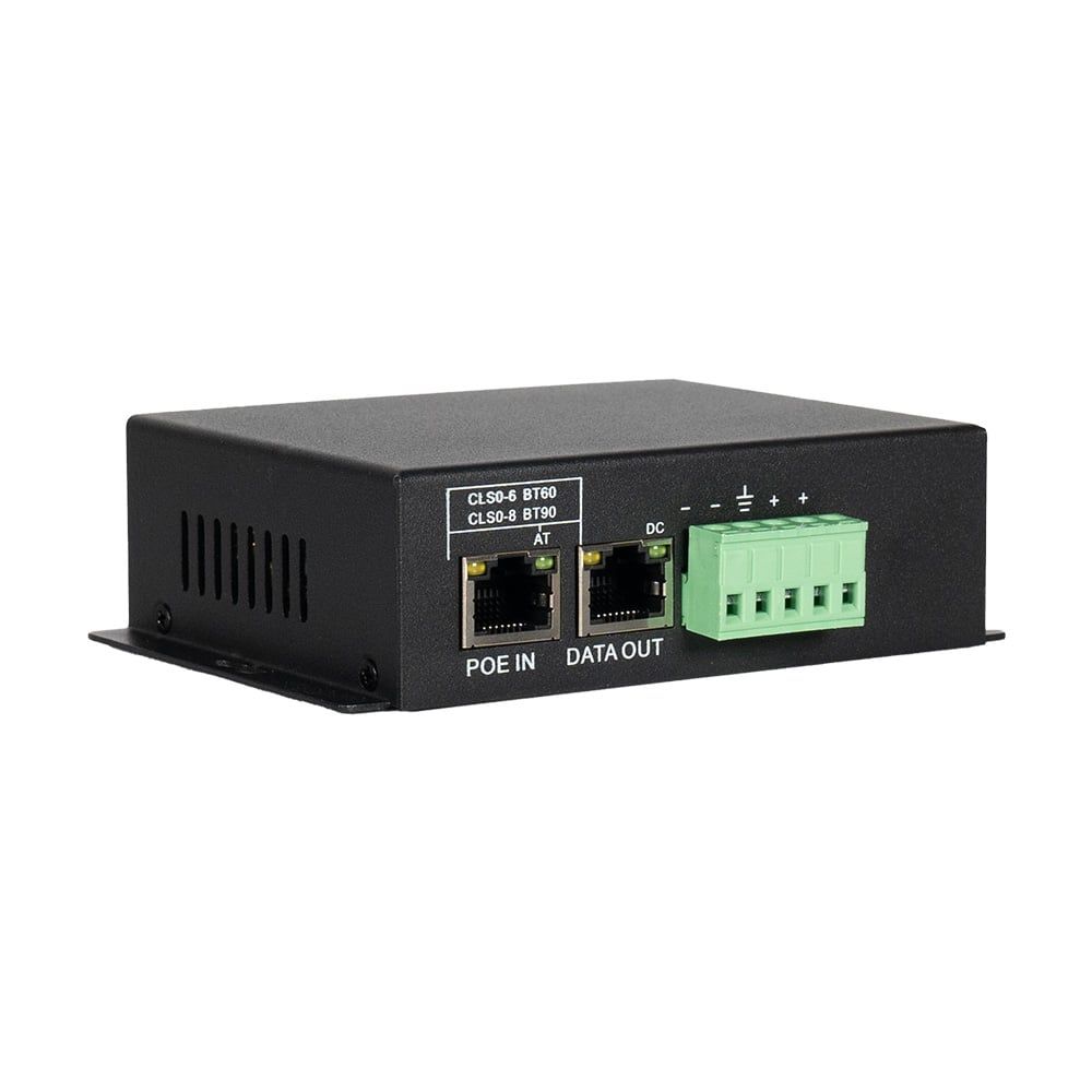 PoE-сплітер; стандарт PoE IEEE802.3bt; потужність PoE 90 Вт; швидкість передачі 10/100/1000 Мбіт/с; вихідна напруга 12 В; вихідний струм 7 А; LED-підсвічування; робоча температура від -40°C до +75°C; клас захисту: IP30; розміри 128 / 90 / 34 мм; вага 0.5 кг