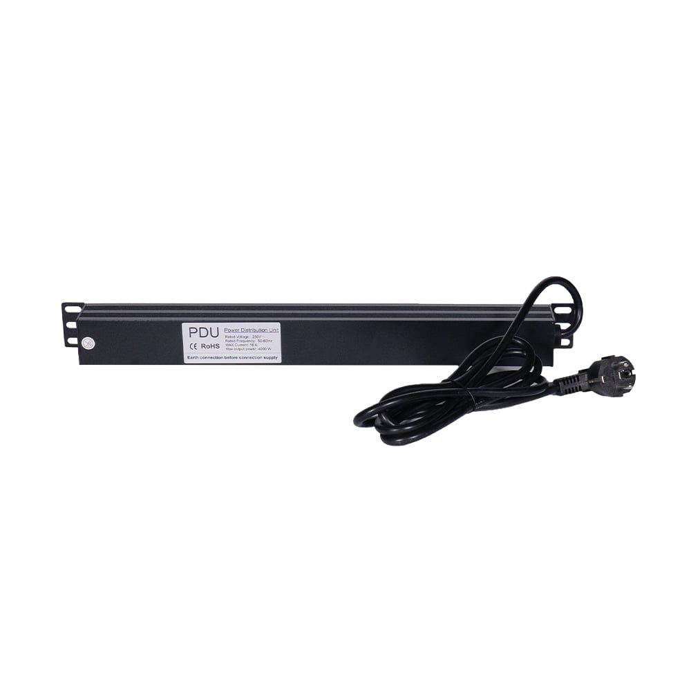 Блок розеток для комутаційної шафи 19"; номінальна напруга 220 В; вхідний струм 16 А; 8 розеток стандарту Schuko; наявність вимикача; форм-фактор 19", висота 1U; довжина кабелю 1.8 м; розмір 482 / 45 / 45 мм