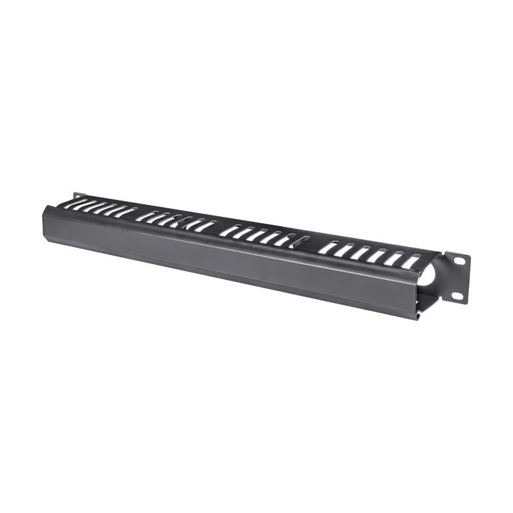 Кабельний організатор з кришкою; монтаж у 19-дюймові стійки, висота – 1U; 24 порти для кріплення кабелів; металевий корпус