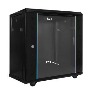 Комутаційна (серверна) шафа з габаритними розмірами: ширина 600 мм, глибина 450 мм, висота 12U – 650 мм; полиця та коліщатка у комплекті; матеріал корпусу: сталь, пофарбована порошковою фарбою чорного кольору; передні двері із загартованого скала; передні двері зачиняються на замок; передбачено кабельні введення і вентиляційні отвори; настінне встановлення; постачання – у розібраному стані