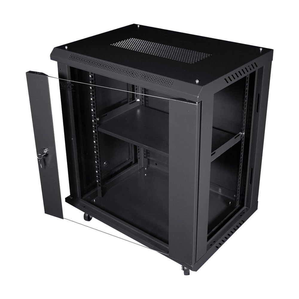 Комутаційна шафа з габаритними розмірами: ширина 600 мм, глибина 450 мм, висота 12U – 640 мм; максимальне навантаження 100 кг; матеріал корпусу: сталь, пофарбована порошковою фарбою чорного кольору RAL9005; дверцята із загартованого скла, зачиняються на замок (2 ключі у комплекті); кабельні введення у верхній, нижній та задній панелях; у комплекті коліщатка для зручного переміщення; ступінь захисту IP20; постачання – у розібраному вигляді