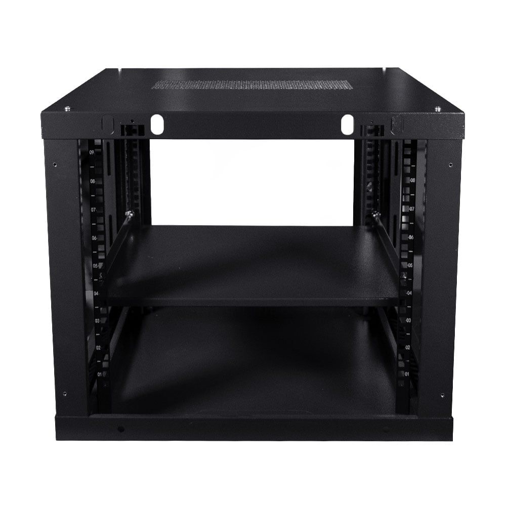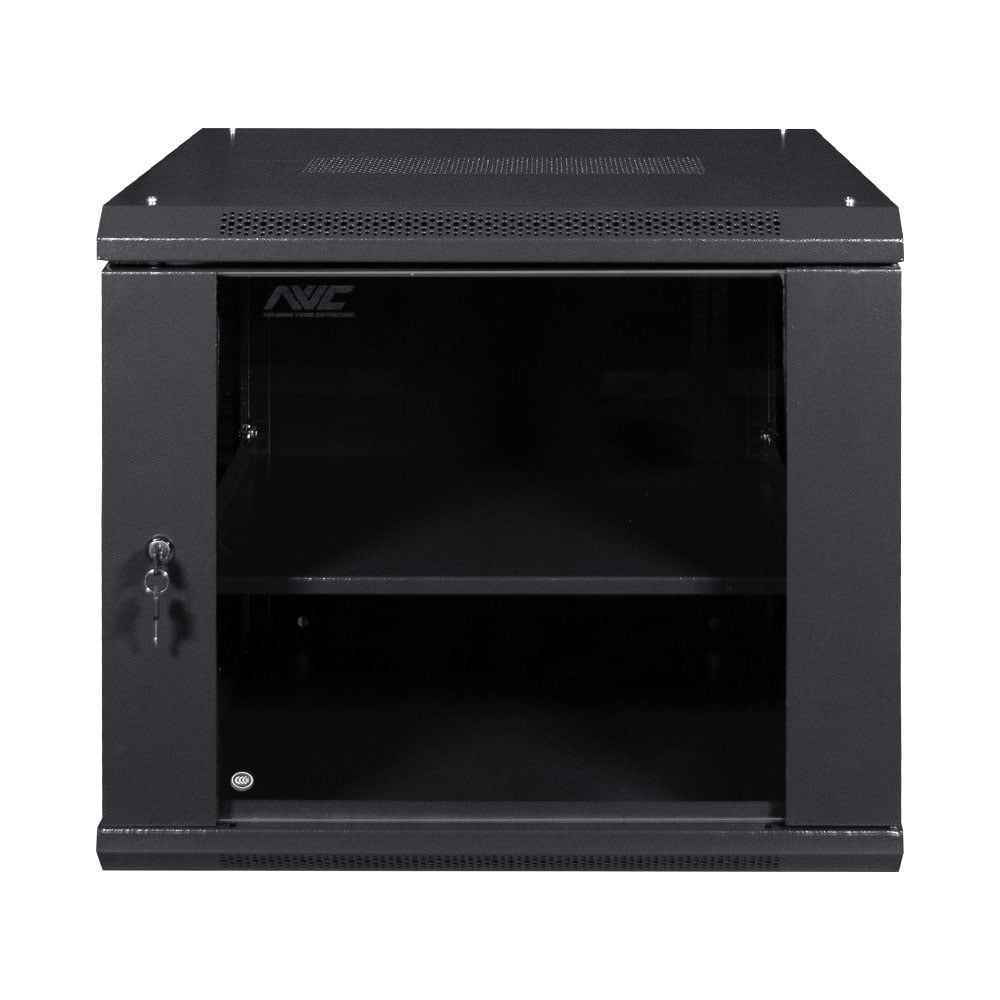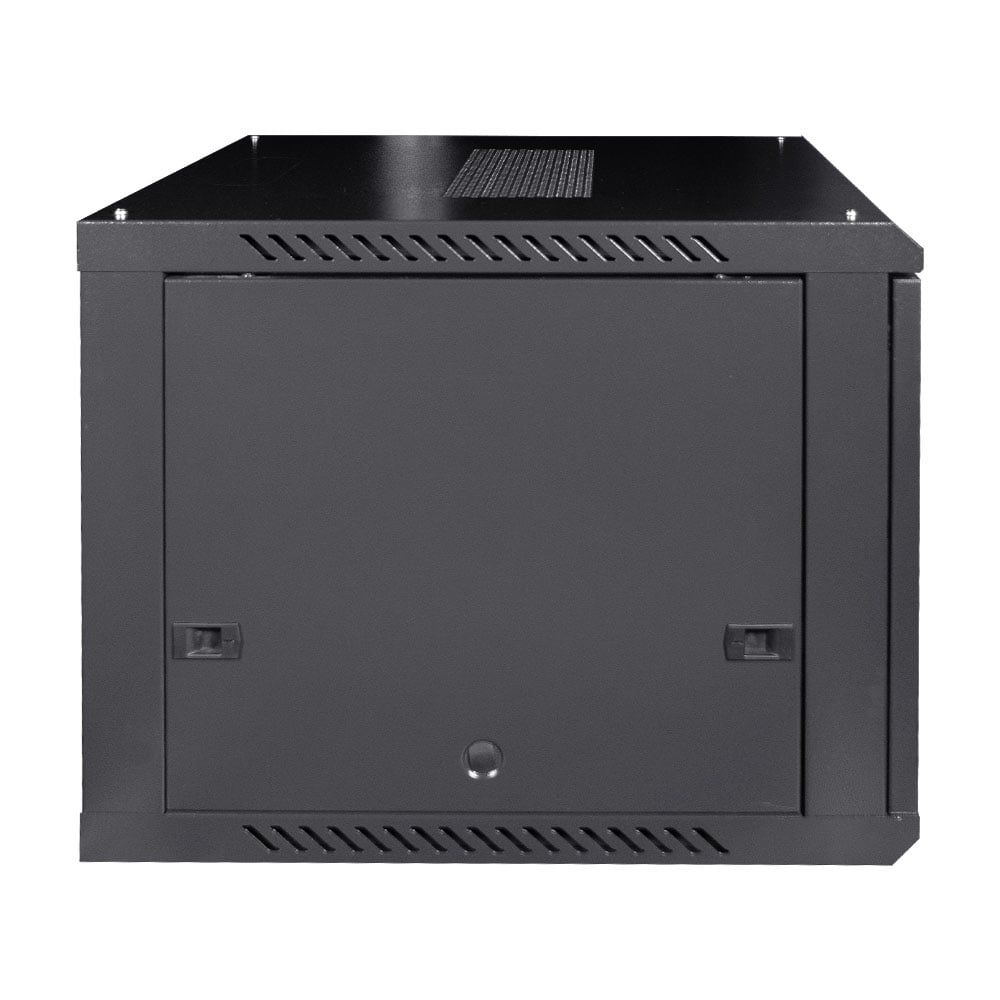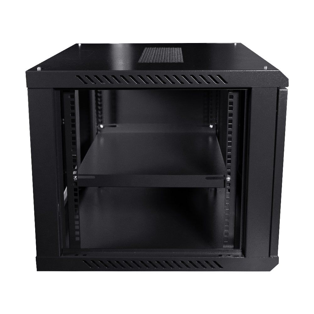 Комутаційна шафа з габаритними розмірами: ширина 600 мм, глибина 600 мм, висота 9U – 500 мм; максимальне навантаження 100 кг; матеріал корпусу: сталь, пофарбована порошковою фарбою чорного кольору RAL9005; дверцята із загартованого скла, зачиняються на замок (2 ключі у комплекті); кабельні введення у верхній, нижній та задній панелях; ступінь захисту IP20; постачання – у розібраному вигляді