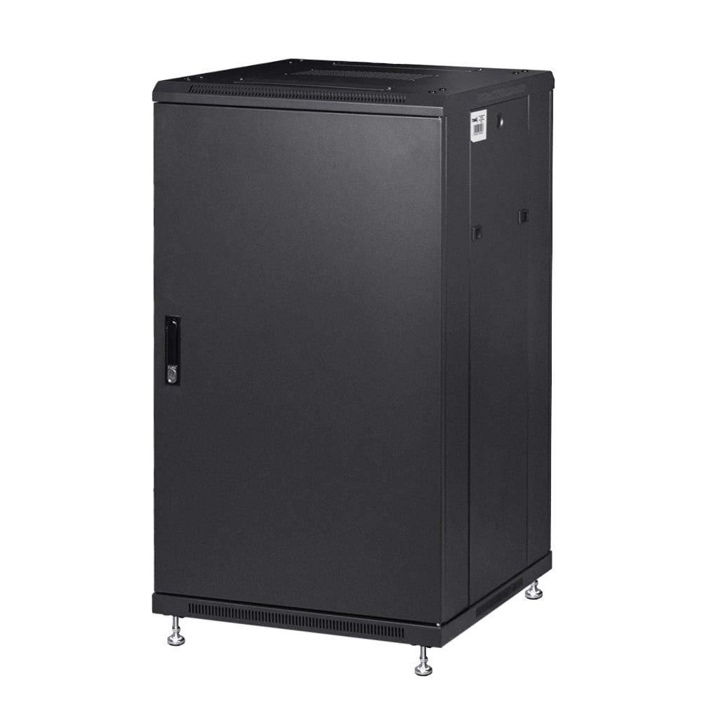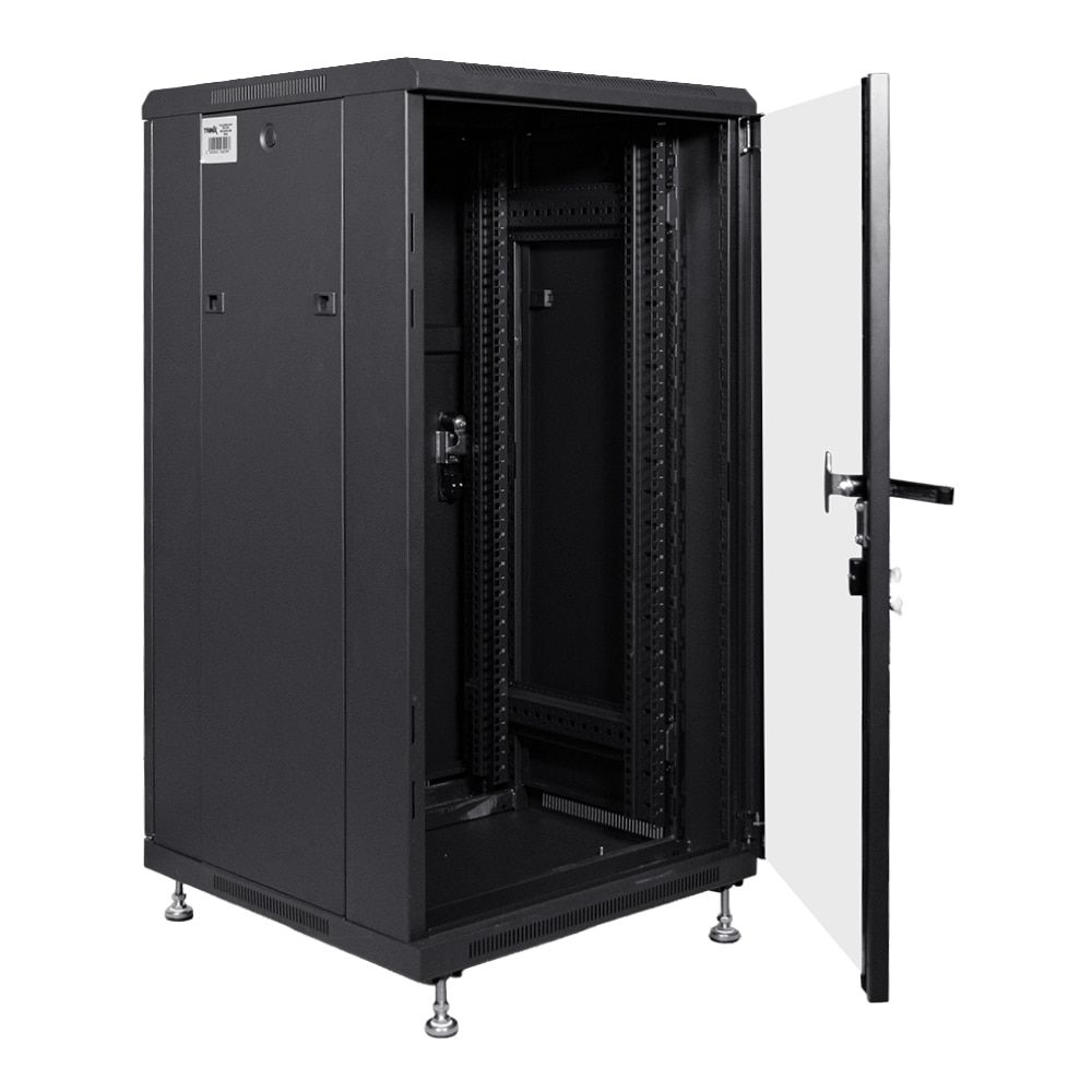 Комутаційна шафа, розбірна, з дверцятами; максимальне статичне навантаження 1000 кг; шафа зачиняється на замок, ключі у комплекті; товщина: вертикальні монтажні рейки – 2.2 мм, монтажна балка – 1.7 мм, бічна панель – 1 мм, передні дверцята – 1.4 мм; задні дверцята – 1.2 мм; рама – 1.2 мм; габаритні розміри: ширина 600 мм, глибина 600 мм, висота 22U – 1166 мм; клас захисту захисту IP20; у комплекті коліщатка для зручного переміщення; колір чорний