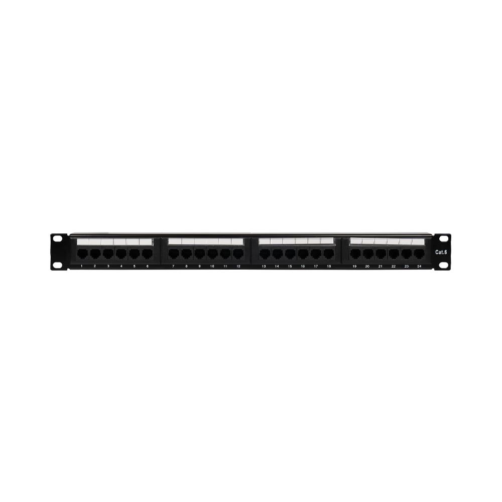 Патч-панель мережева на 24 порти для встановлення у стійки/шафи 19 дюймів; висота 1U; конектор RJ45; кабель UTP (неекранована вита пара), категорія CAT5/CAT6; задній організатор кабелю