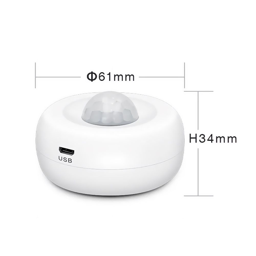 Бездротовий стельовий ІЧ-датчик руху з підтримкою WiFi 2.4 ГГц (IEEE 802.11b/g/n) та можливістю керування і налаштування через мобільний застосунок Tuya; працює без підключення до централі; дальність детекції 6 м, кут детекції 360°; живлення: 2 батареї AAA/LR03 3V, у комплекті; вхідна напруга DC 5 В/2 А (USB для зарядки лише придатних до цього акумуляторних батарей); споживання у режимі очікування 75 мкА, у режимі тривоги 60 мА; сповіщення про низьку напругу нижче 2.2 В; монтаж стельовий або настінний; кнопка скидання; робоча температура -10C° - +50°C; розміри Ø61 / 34 мм