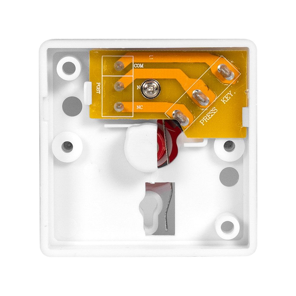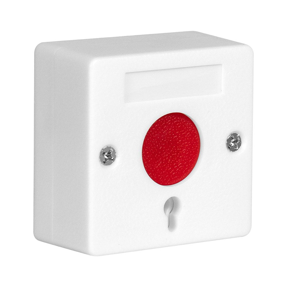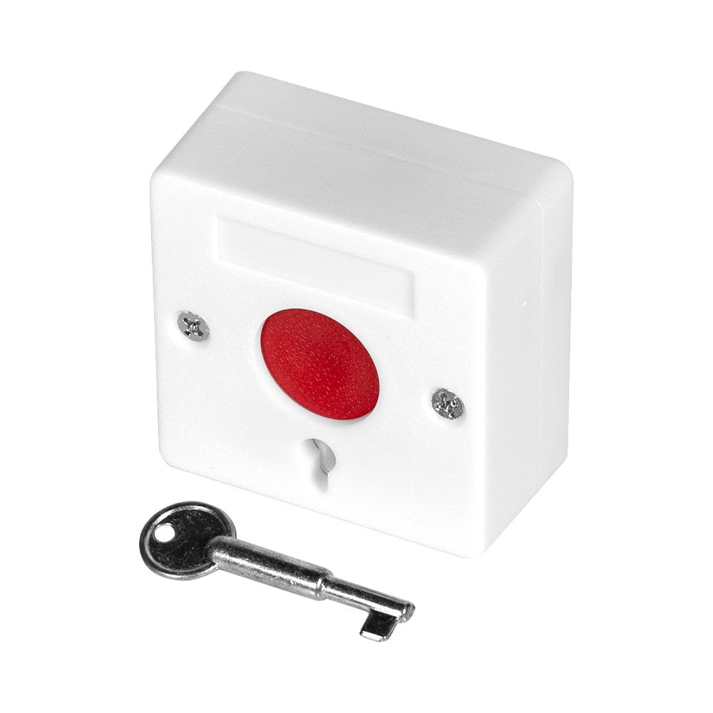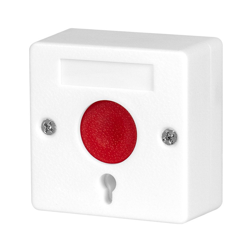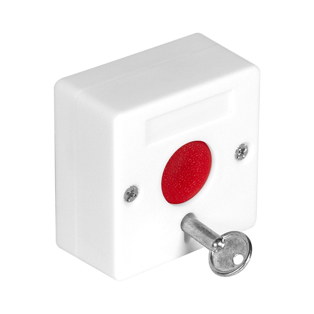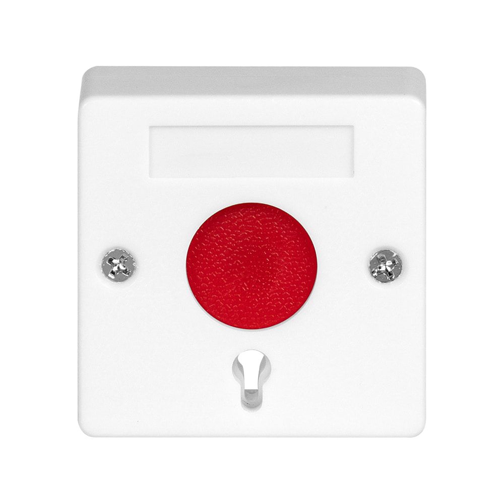 Тривожна кнопка для прихованої подачі сигналу тривоги у разі виявлення небезпеки; тип контакту Н/Р (нормально-розімкнений), Н/З (нормально-замкнений); тип монтажу накладний; з розфіксацією ключем, ключ для розблокування у комплекті; розміри 52 / 52 / 15 мм