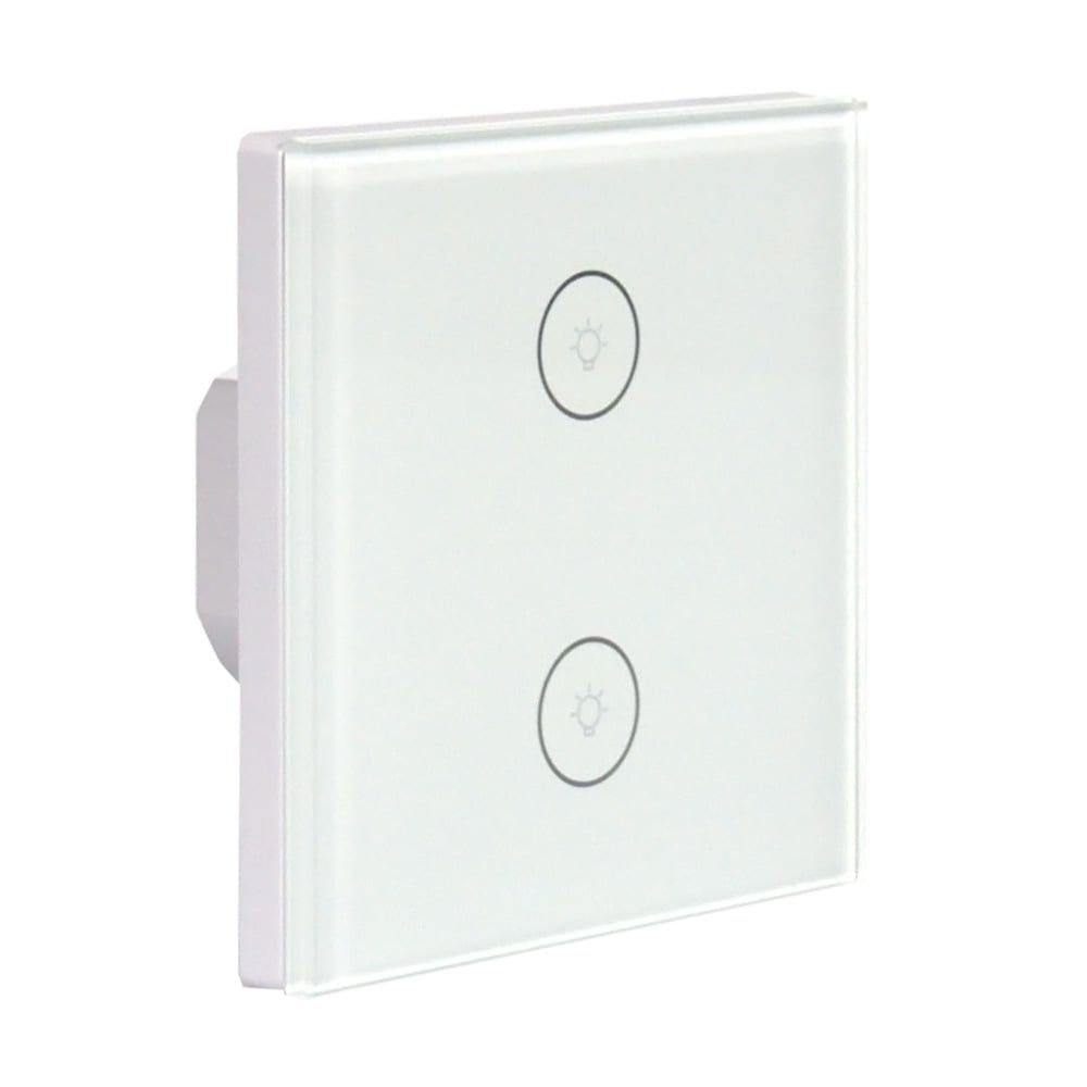 Розумний вимикач світла подвійний сенсорний з підтримкою WiFi 2.4 ГГц (IEEE 802.11b/g/n) та можливістю керування і налаштування через мобільний застосунок Tuya; дальність зв’язку 30 м; номінальна напруга AC 100-240 В, 50/60 Гц; максимальне навантаження на кожен вихід 800 Вт; номінальний струм 10 А; струм споживання у режимі очікування 0.1 мА; голосове керування через Google Assistant / Amazon Alexa; підсвічування кнопок керування; матеріал вогнестійкий пластик; розміри 85 / 85 / 35 мм