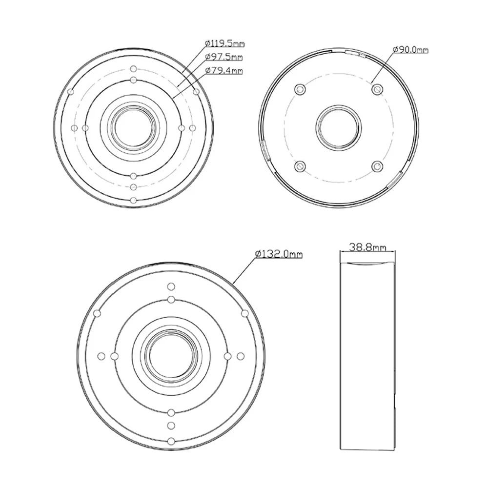 Розподільна коробка для купольних та циліндричних камер для настінного або стельового монтажу, є нижній вхід та бічний вхід для кабелю. Ступінь захисту IP65, металевий корпус. Розміри 132 / 38.8 мм, вага 215 г