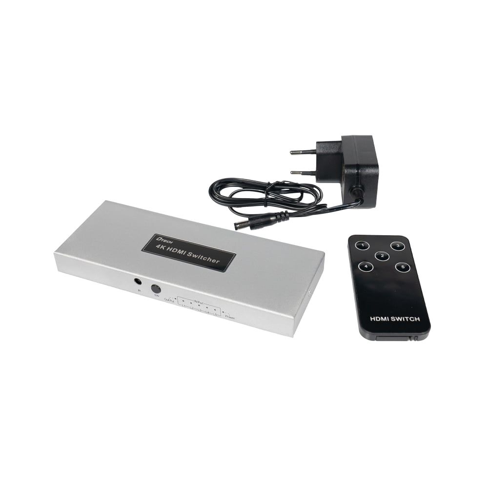 4K HDMI комутатор; 5 вхідних портів HDMI, 1 вихідний порт HDMI; підтримка роздільної здатності до 3840*2160@60Hz; аудіоформати DTS-HD / Dolby-trueHD / LPCM7.1 / DTS / DOLBY-AC3 / DSD / HD(HB); ІЧ-пульт керування у комплекті; живлення DC 5 В; розміри 57.5 / 46 / 32.5 мм