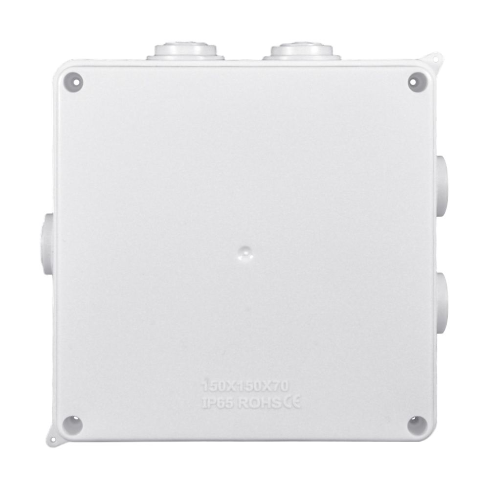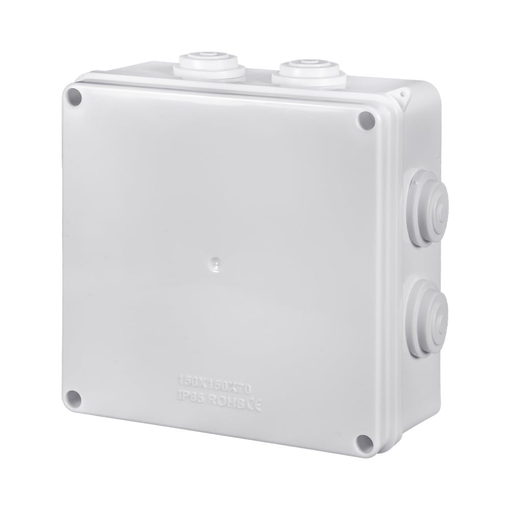 Коробка розподільна з 7 кабельними вводами; у комплекті: 7 заглушок для вводів та комплект для кріплення кришки; клас захисту IP65; зовнішнього та внутрішнього встановлення; матеріал – пластик; розміри 150 / 150 / 70 мм