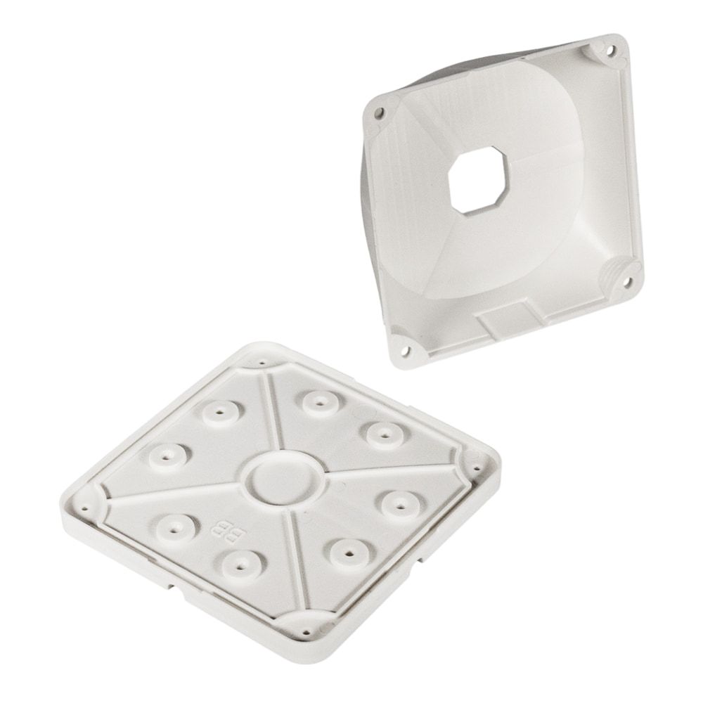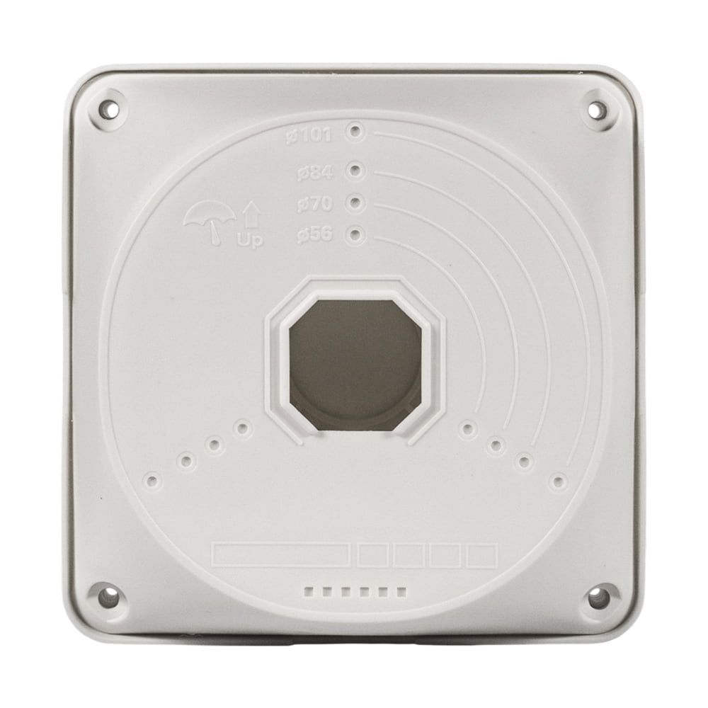 Монтажна коробка для встановлення камер відеонагляду; матеріал – пластик, стійкий до ультрафіолету та перепадів температур; накладний монтаж на стіну або стелю; гвинти для кріплення у комплекті; розміри 130 / 130 / 40 мм; вага 250 г