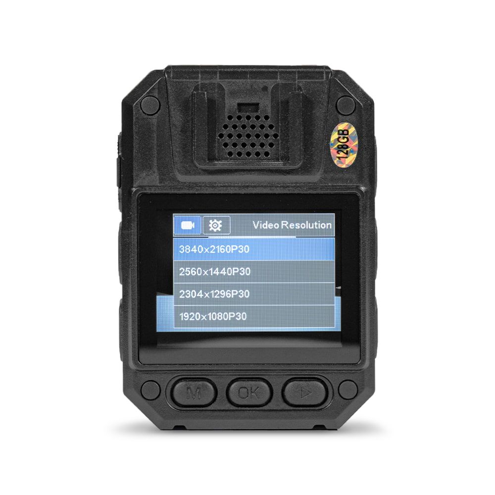 Нагрудний відеореєстратор з вбудованим GPS. Якість запису відео: 3840x2160/30fps, 2560x1440/30fps, 2304x1296/30fps, 1920x1080/30fps, 1280x720/30fps; циклічний запис відео: 5/10/15/20/30 хв. Роздільна здатність фото: до 40 Мп. Кут огляду: 140°. ІЧ-підсвічування: до 10 м; LED-підсвічування, червоно-синя індикація та лазерний діод; запис на вбудовану пам'ять 128 ГБ. Запис звуку: до 7 м. РК-екран 2". Роз'єми: mini-USB. Ємність батареї: 3100mAh. Час роботи: до 12 годин. Ступінь захисту IP66. Габаритні розміри: 83 / 56 / 28 мм. Вага: 132 г. У комплекті автомобільний зарядний пристрій, три види кріплення, шнур mini-USB. Є меню англійською мовою