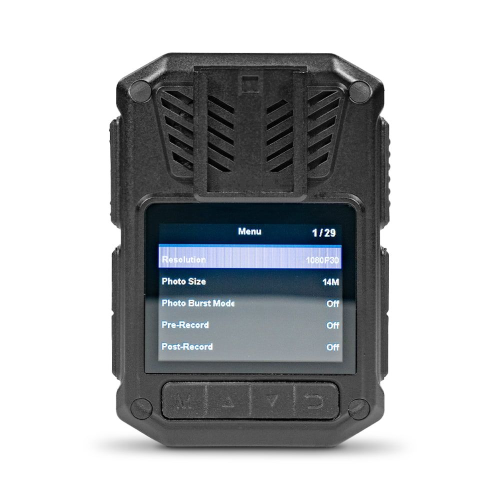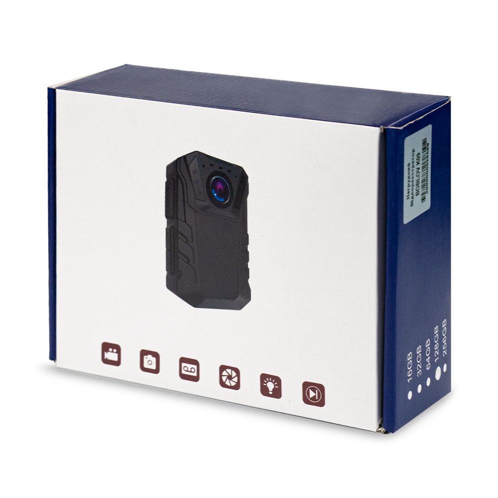 Нагрудний відеореєстратор з запасною батареєю. Якість запису відео: 2304x1296/30fps; 1920x1080/30fps; 1280x720/30fps; циклічний запис відео: 5/10/15/20/30 хв. Роздільна здатність фото: до 40 Мп. Кут огляду: 120°. ІЧ-підсвічування: до 10 м; LED-підсвічування, червоно-синя індикація; запис на вбудовану пам'ять 128 ГБ. Запис звуку: до 7 м. РК-екран 2". Датчик руху. Роз'єми: mini-USB. Ємність батареї: 2800mAh. Час роботи: до 12 годин. Ступінь захисту IP66. Габаритні розміри: 88 / 62 / 34 мм. Вага: 147 г. У комплекті док-станція, два види кріплення, шнур mini-USB та запасна батарея. Меню лише англійською мовою