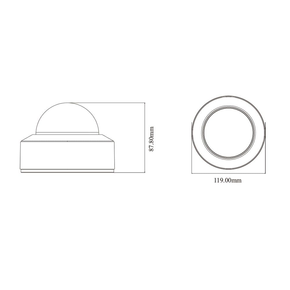 5Mp IP-відеокамера з функціями аналітики; матриця 1/2.7″ CMOS; роздільна здатність 5Mp (2592*1944); фіксований об’єктив f=2.8 мм; кути огляду 99.87° горизонтальний, 70.36° вертикальний; ІЧ-підсвічування до 30 м; відеокомпресія H.265+/H.265/H.264+/H.264; чутливість 0.002 Люкс @F1.6, AGC увімкнено, 0 Люкс з ІЧ; 3 відеопотоки; мережа: RJ45 100M; ONVIF; живлення DC12V/PoE, споживання 6 Вт; 1 аудіовхід, 1 аудіовихід, вбудований мікрофон; 1 тривожний вхід, 1 тривожний вихід; запис на microSD карту (до 256 Гб); ступінь захисту IP67; габаритні розміри Ø 119 / 87.8 мм; вага 0.65 кг