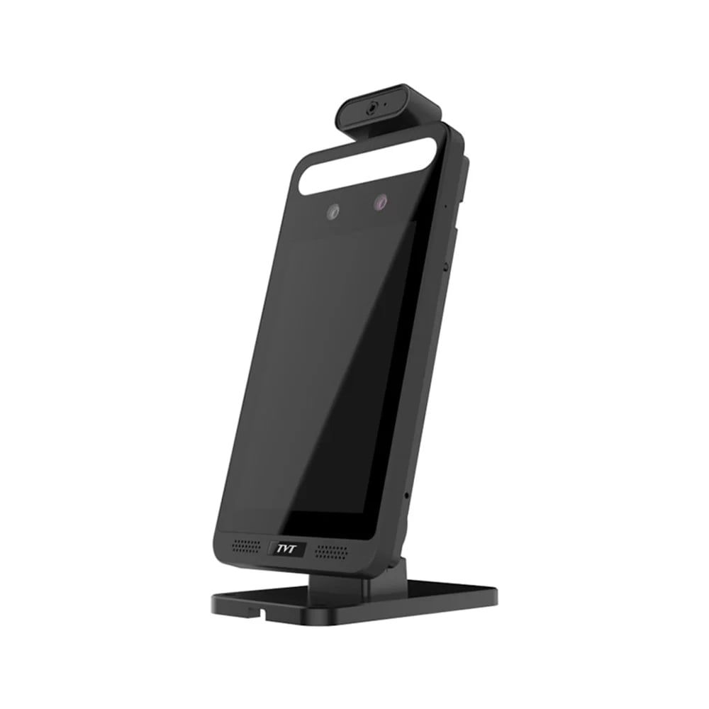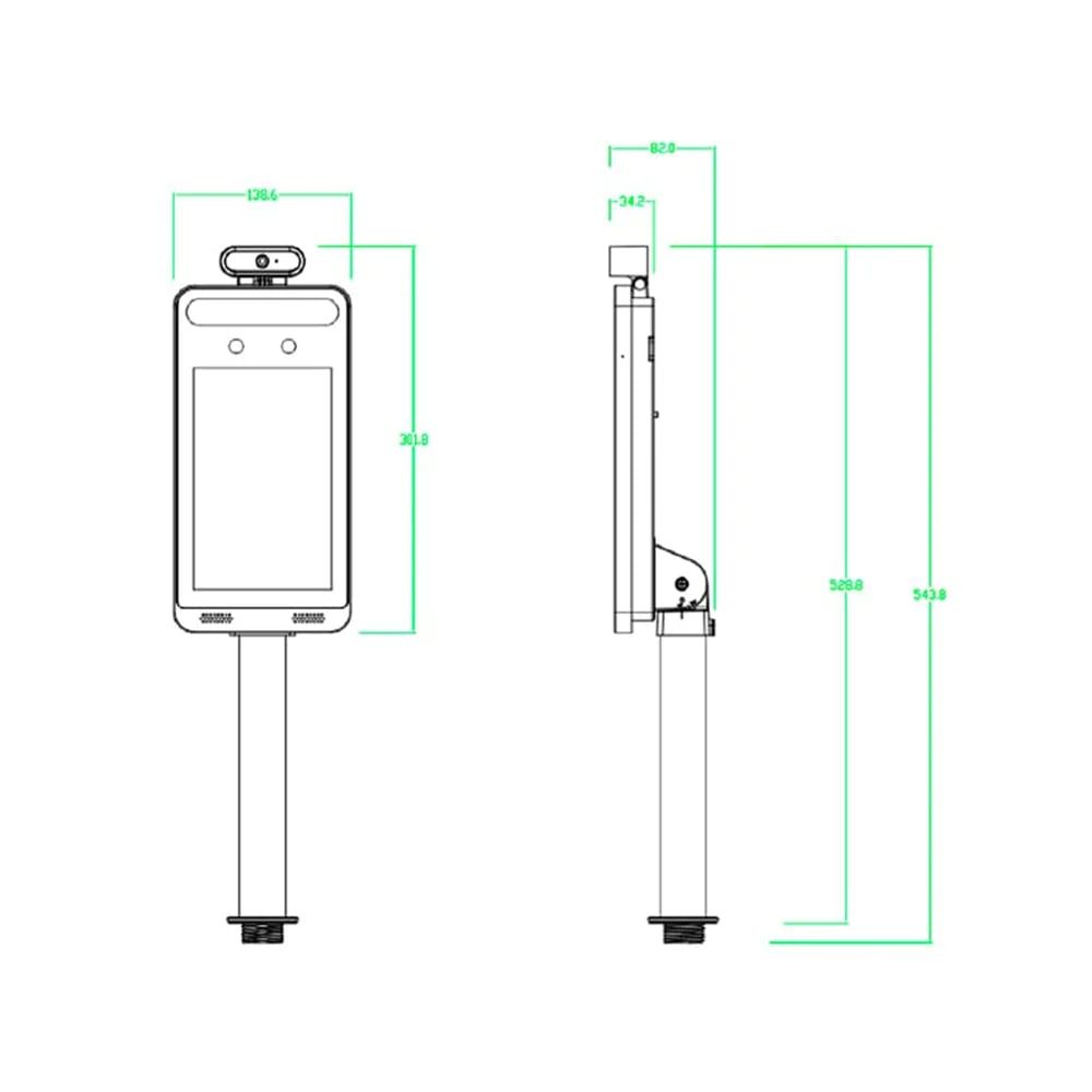 Біометричний термінал розпізнавання облич, в тому числі у масках, з безконтактним вимірюванням температури тіла; сенсорний 8-дюймовий LCD-екран з роздільною здатністю 1280*800 пікселів; діапазон вимірювання температури 32~43°С, точність ±0.3°С; відстань вимірювання 25-50 см; 2Mp камера з подвійним об’єктивом, матриця 1/2.8" CMOS, фокусна відстань f=3.97 мм; висота розпізнавання обличчя 1.2-2.2 м, дальність розпізнавання 0.3-2 м, швидкість розпізнавання 0.5 секунд на особу, точність розпізнавання 99.7%; база шаблонів облич 10000; світлодіодне підсвічування до 3 м; вбудовані мікрофон та динамік; інтерфейси: RJ45 100M, 2 тривожні входи, 2 тривожні виходи, USB, Wiegand 26/34, RS485, вихідне реле для підключення електрозамка; слот для карти пам’яті до 128 ГБ; тампер; живлення 12 В; потужність споживання 12 Вт; розміри 301.8 / 138.6 / 34.2 мм; вага 1.2 кг