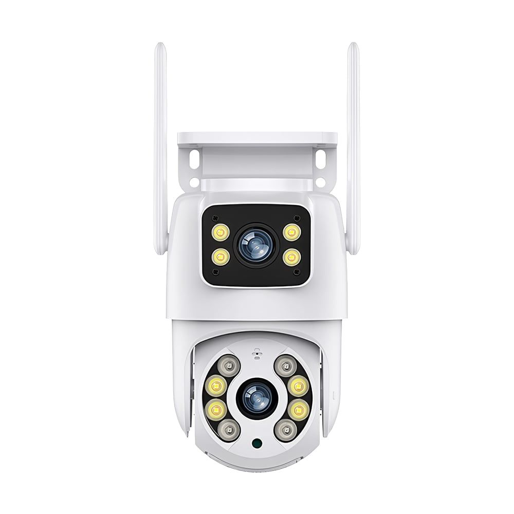 3Mp+3Mp вулична поворотна IP-відеокамера з підтримкою Wi-Fi (2.4 ГГц), з подвійним об’єктивом і подвійним підсвічуванням; об’єктив 3.6 мм + 3.6 мм; матриця 1/2.8″ CMOS x2; роздільна здатність запису 2048*1536 x2; кут повороту 0-355°, кут нахилу 0-90°; ІЧ-підсвічування до 20 м + LED-підсвічування до 20 м; віддалений моніторинг на смартфонах (застосунок Tuya); детекція руху, виявлення людини, автотрекінг; вбудований мікрофон та розмовний динамік; запис за детекцією на карту microSD (до 128 ГБ) або у хмару; живлення 5 В/1.5 А через інтерфейс USB Type-C; робоча температура -20°C~+55°C; клас захисту IP66; габаритні розміри 145 / 102 мм