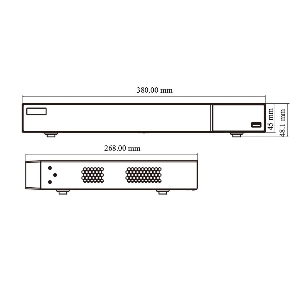 MHD-відеореєстратор 16-канальний гібридний АHD/TVI/CVI + 8 каналів IP; підтримка роздільної здатності 5MP/4MP/1080P/960P/720P у форматі H.264/H.265/H.265+; вхід BNCx16, виходи: HDMI / VGA / CVBS; запис 5Mp lite @10fps, 4MP lite/1080P @12fps, 1080 lite/720P/WD1/D1 @25fps, IP@25fps; бітрейт на кожному каналі: 32Kbps ~ 5Mbps; аудіо: вхід RCAx8 / вихід RCAx1; тривога: 16 входів / 4 виходи; мережа RJ45 1000Mbps; перегляд архіву локально/віддалено 16/16 каналів; підтримка роботи з iOS, Android; інтерфейс RS485х1, USB2.0х1, USB3.0х1, SATA x2 до 10 ТБ, E-SATA x1; живлення DC12V/4A, споживання 15 Вт; розміри: 380 / 268 / 45 мм