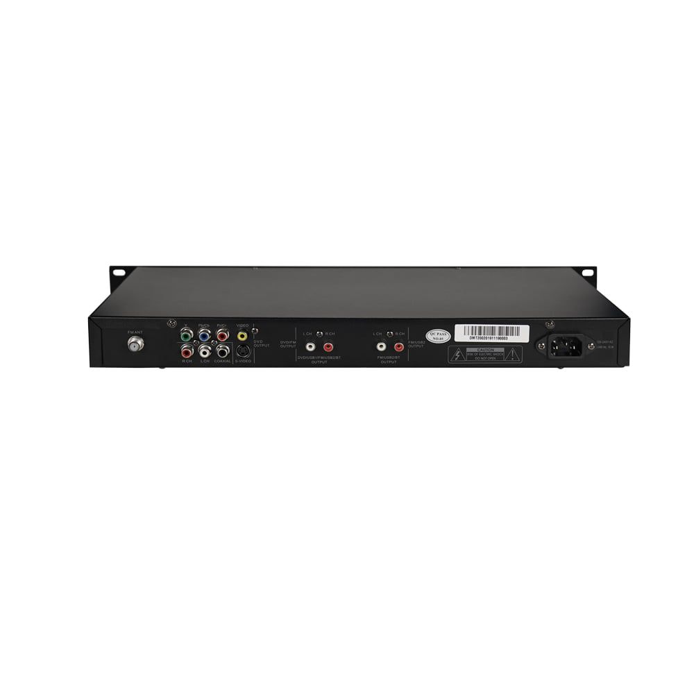 CD-плеєр для монтажу у стійку 19". Підтримує формати CD/MP3/MP4/VCD/DVD/FM, Bluetooth. З інфрачервоним бездротовим пультом дистанційного керування для вибору джерела та регулювання гучності. З двома окремими лінійними стереовиходами для DVD/USB1 і FM USB, стереовихід DVD і коаксіальний вихід. аудіовхід 0.775 В, 600 Ом; відеовхід 0.776 В, 75 Ом; частотна характеристика 20-18000 Гц; THD 60 дБ; співвідношення S/N > 80 Дб; робоча температура +5 ℃ ~ +40 ℃; вологість: <95%; споживання енергії 300 Вт; джерело живлення AC 100-220 В  50-60 Гц; AC запобіжник 250 В / 6.3 A, повільного та відновлювального типу: розміри 484 / 365 / 44 мм; вага 2.7 кг