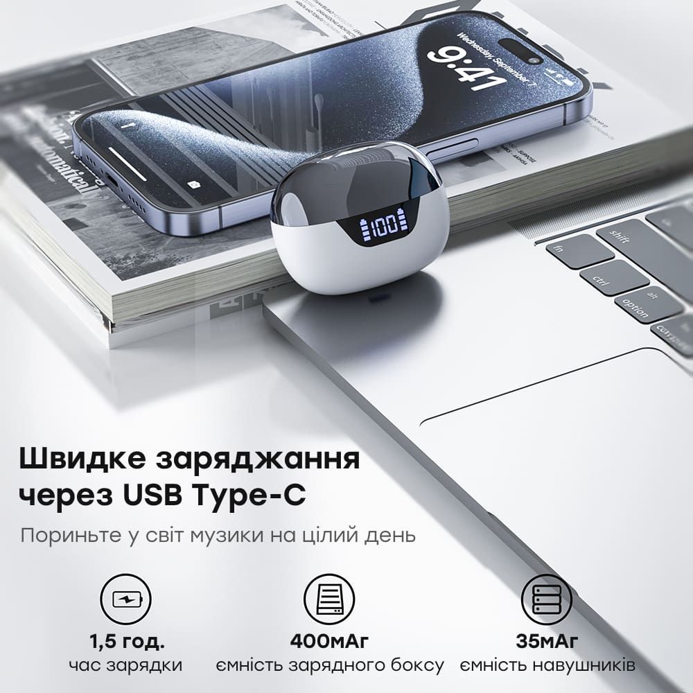 Бездротові навушники типу TWS з LED-дисплеєм, з підтримкою Bluetooth 5.3; дальність відтворення звуку до 12 м; функції шумозаглушення ANC та ENC; 4 вбудовані мікрофони; ємність акумуляторної батареї навушників 35 мА·год, зарядного кейса – 400 мА·год; тривалість роботи на одному заряді до 6 годин для аудіо, до 3.5 годин для дзвінків, максимальний час роботи із зарядним кейсом до 36 годин; порт USB-C; час заряджання кейса 1.5 години, навушників 1.5 години; у комплекті зарядний кейс, кабель USB Type-C, змінні амбушури