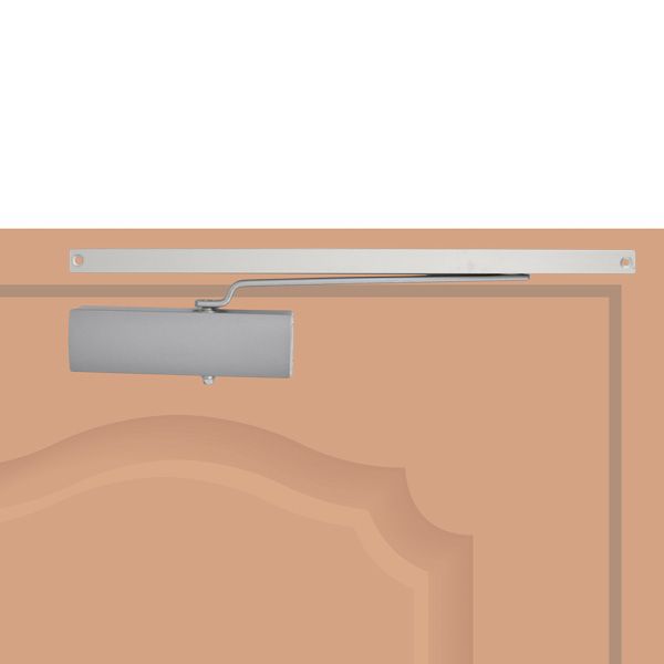 ATIS DC-204 SL Silver дотягувач верхнього встановлення з ковзаючою шиною. Комерційне використання, напрацювання на відмову 500000 циклів. Зусилля зачинення від DIN3 (вага дверей від 60 до 80 кг, ширина від 500 до 1200 мм). Функція Back-check. Колір срібло.