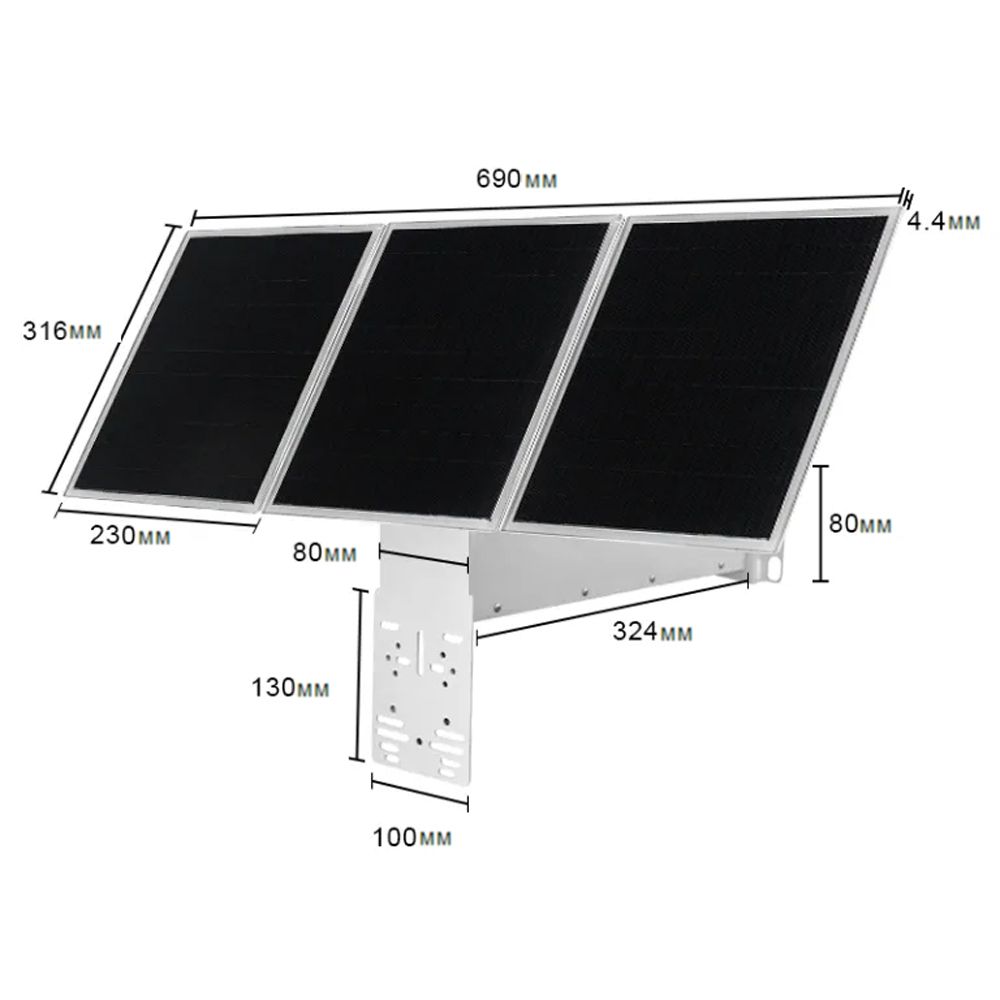 Автономне джерело живлення з сонячними панелями потужністю 60Вт (3 шт. по 20Вт) і вбудованим акумулятором 12В/180Вт·год забезпечує цілодобове живлення систем відеоспостереження, контролю доступу та інших пристроїв. Використовує монокристалічні панелі з коефіцієнтом перетворення до 24%, що дає змогу ефективно накопичувати сонячну енергію. Ємний акумулятор типу 18650 (18 шт.) гарантує автономну роботу до декількох днів. Компактні розміри і невелика вага забезпечують зручність транспортування і монтажу.
