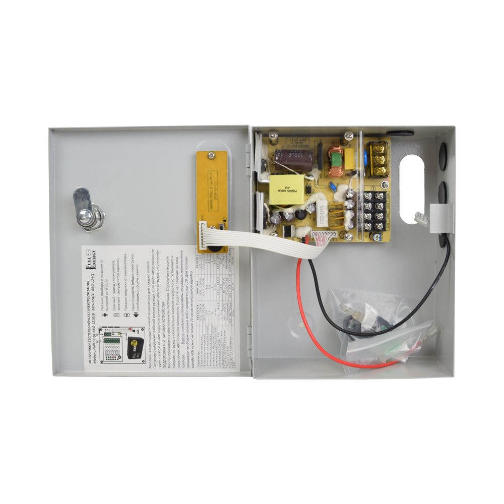 Безперебійний блок живлення імпульсний, 4-х канальний. вихід: 12...14В/4А клемник; вхід: ~175...245В, клемник; металевий корпус з кришкою і замком; стабілізація напруги, захист від глибокого розряду. Можливе встановлення акумулятора 1,2Ah, 2.2Ah, 4Ah, 7Ah. Розміри: 200 х 163 х 72 мм
