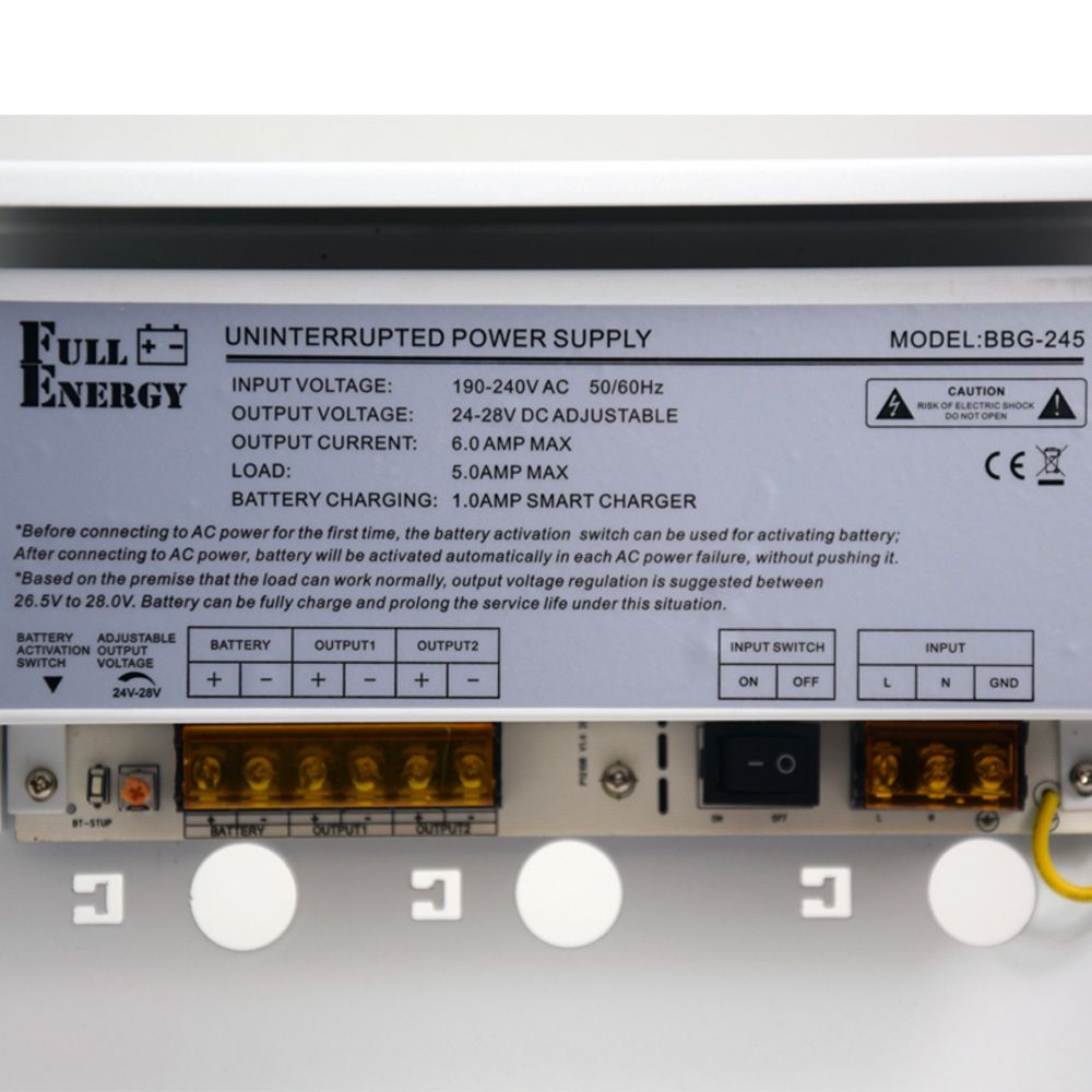 Безперебійний блок живлення, імпульсний, двоканальний; вихід: 24В/5А, клемник; вхід: ~100-240В, клемник; металевий корпус з кришкою і замком; стабілізація напруги, захист від глибокого розряду. Можливе встановлення 2 акумуляторів 7Ah. Розміри 338 х 308 х 83 мм