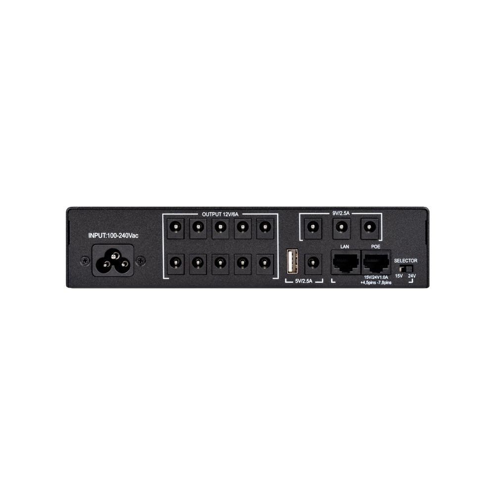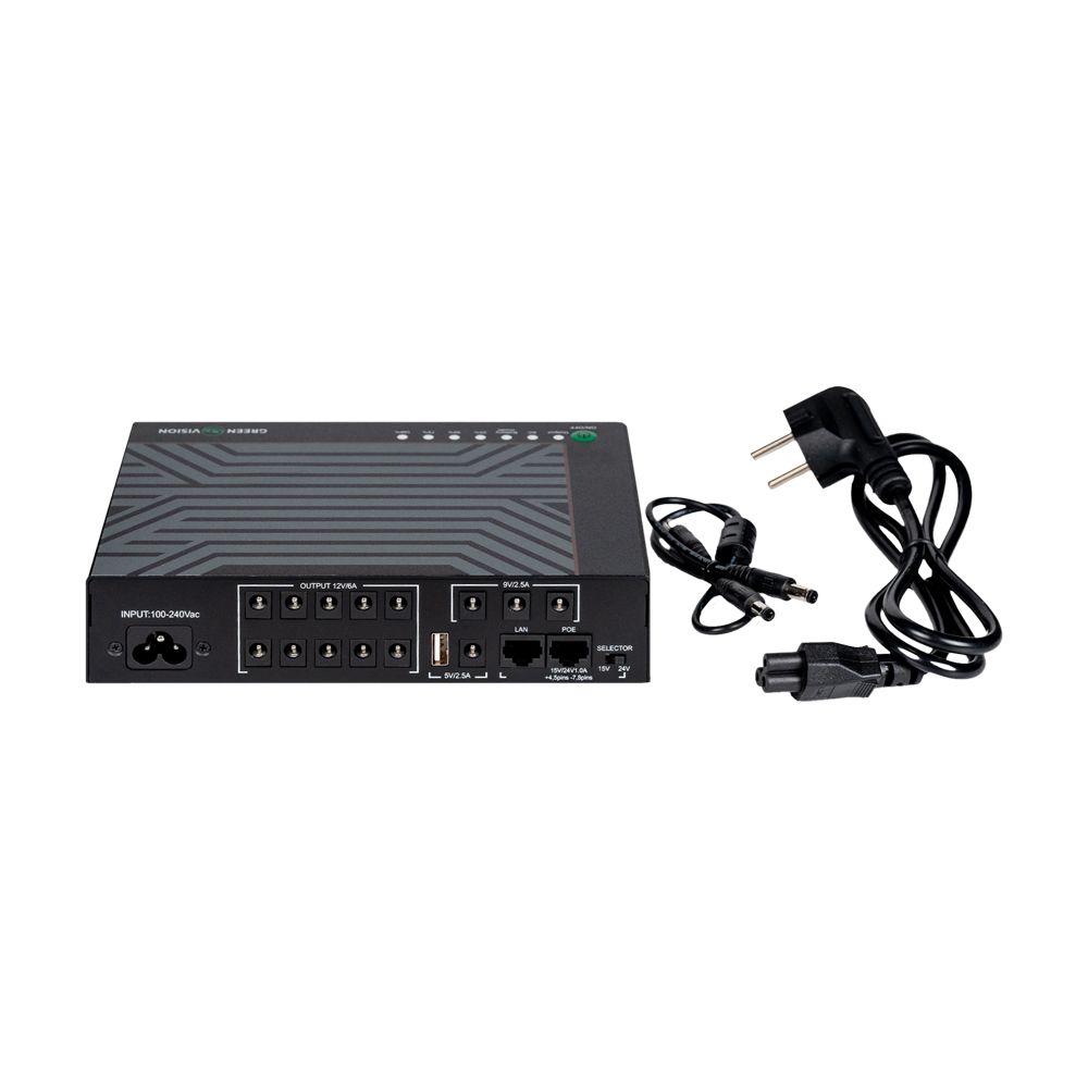 ДБЖ GreenVision GV-702-UPS-DC18-100W призначено для забезпечення стабільної роботи різних пристроїв у разі вимкнення електроенергії. Оснащений вбудованим акумулятором ємністю 17.6 А·год, що дає змогу підтримувати роботу обладнання до 10 годин без перерви. Підходить для Wi-Fi роутерів, маршрутизаторів, терміналів і медіаконвертерів, а також іншої низьковольтної апаратури. Потужність: 100 Вт. Вихідна напруга: DC 5В/ 9В /12В. Ємність: 17600 мА·год. Струм: 6/2.5 А. Тип індикації: світлодіод (червоний, зелений). Тип підключення до мережі: євровилка. Тип підключення споживача: RJ-45, USB, DC 5.5/2.1. Захист від короткого замикання, від перевантаження, від перезарядження. Живлення: 220 В або Li-ion батарея. Матеріал корпусу: метал