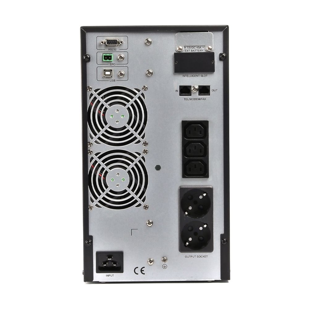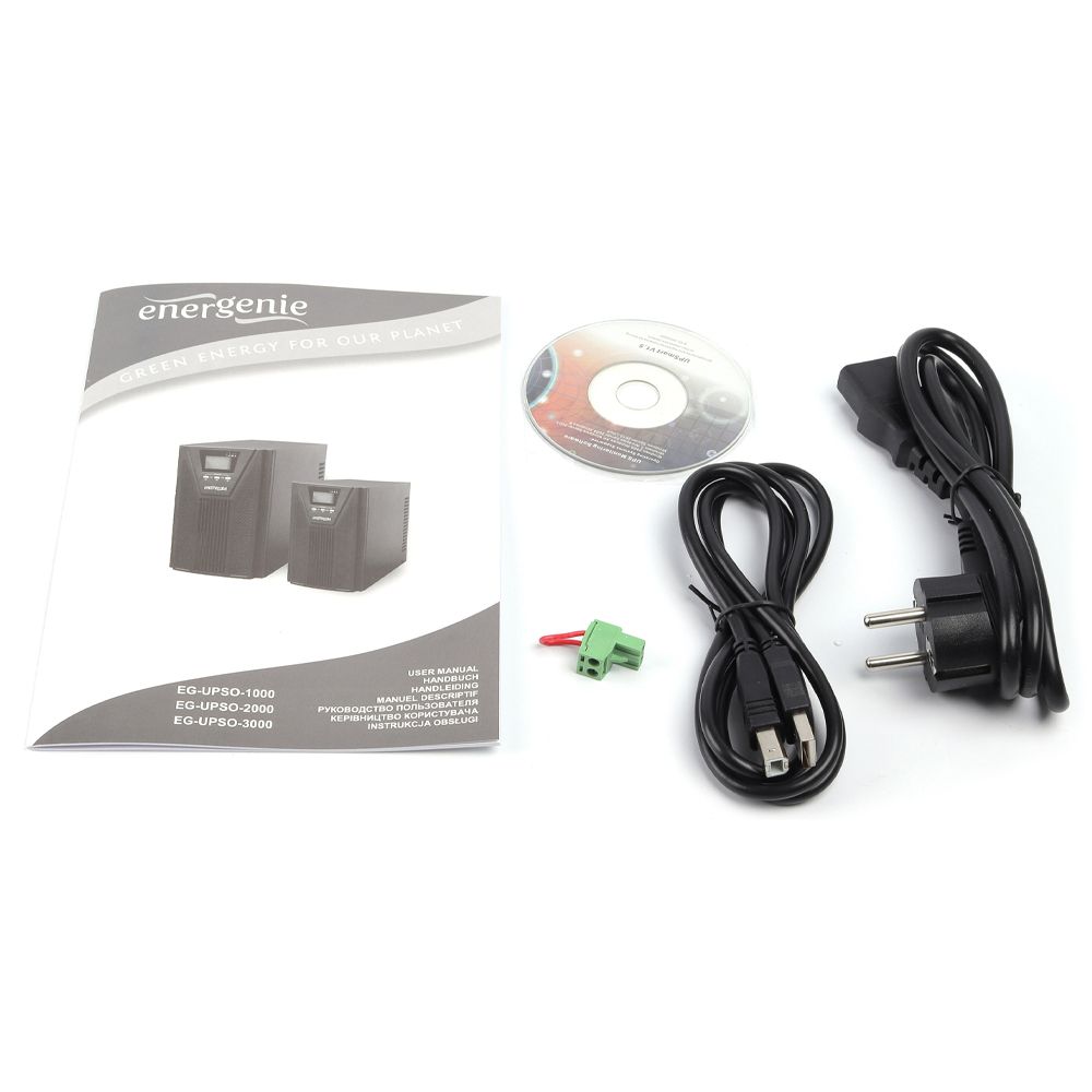 ДБЖ EnerGenie EG-UPSO-3000 – пристрій із типом архітектури подвійного перетворення (On-Line), потужністю 3000 В·А / 2700 Вт із чистою синусоїдою на виході, призначений для захисту чутливої електроніки. Оснащений шістьма вбудованими акумуляторами 12В / 9А·год, що забезпечує до 20 хвилин автономної роботи й заряджається до 90% за 3 години. Підтримує AVR, оснащений РК-дисплеєм, інтерфейсами USB Type-B, RS-232, EPO і системою звукових і візуальних сповіщень. Підходить для дому, офісу та обладнання з високими вимогами до електроживлення.