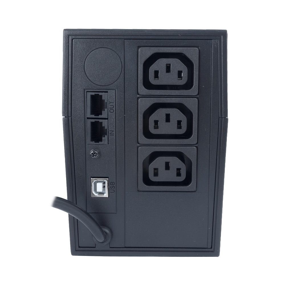 Тип ДБЖ: Лінійно-інтерактивний. Потужність: 800 ВА/ 480 Вт. Вихідні роз'єми: 3 розетки IEC320 C13 з резервним живленням. Вхідна напруга: 220/230/240 В. Форма напруги: Ступенева апроксимація синусоїди. Автоматичне регулювання напруги (AVR). Захист ДБЖ від перевантажень. Захист у разі короткого замикання. Акумуляторна батарея герметична необслуговувана свинцево-кислотна 12В 7,2 А-год. Час перезаряджання: 3-4 години до 90%. Захист АКБ. Світлодіодна індикація. Звукова сигналізація