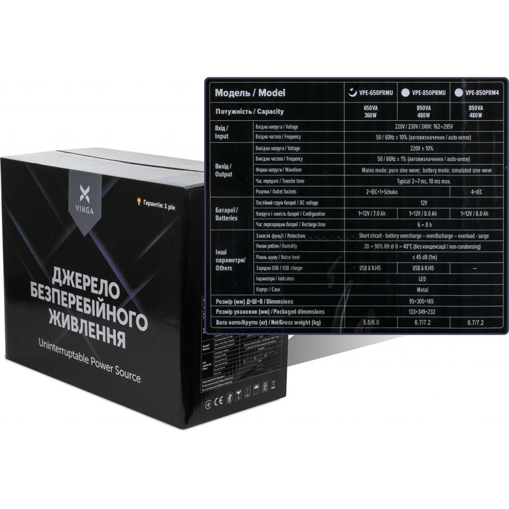 Джерело безперебійного живлення Vinga VPE-650PRMU 650ВА / 360 Вт з LED-індикацією з USB у металевому корпусі
