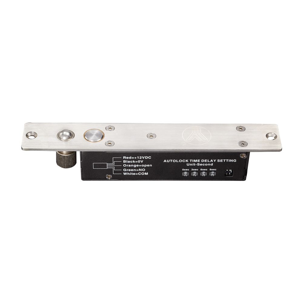 Врізний електрорігельний замок з нержавіючої сталі, сила утримання 2000 кг. Нормально відкритий (NO). Замок відкритий за замовчуванням (без живлення). Вбудований таймер затримки зачинення дверей: 0,3,6 і 9 сек і датчик стану двері. Максимальна відстань спрацювання 8 мм. Робочий струм: 1200 мА, в режимі очікування: 200 мА. Живлення 12 В. Розміри 220 x 34 x 38 мм.