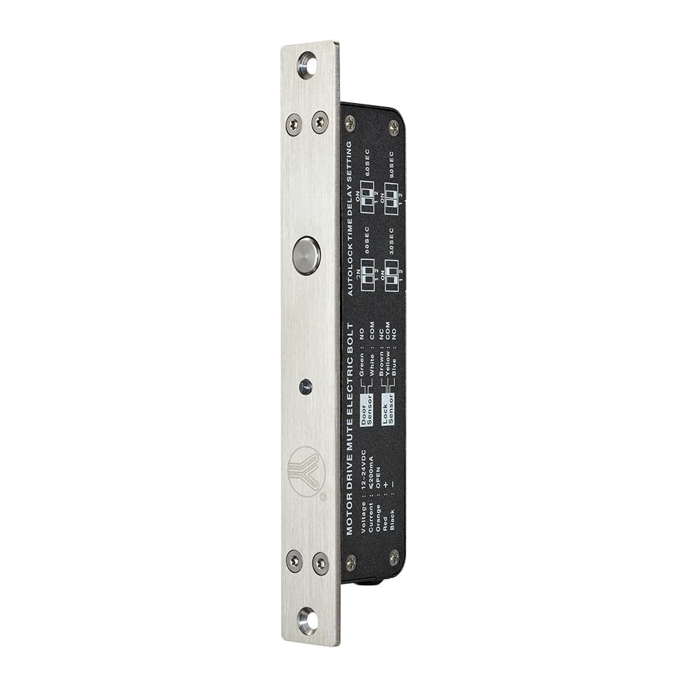 Врізний електроригельний замок з електроприводом, LED індикацією, з нержавіючої сталі, сила утримання 1300кг. Нормально відкритий (NO). Статус дверей (NO/COM). Статус замку (NC/NO/COM). Вбудований таймер затримки зачинення дверей: 0,3,6 і 9 сек. Максимальна відстань спрацьовування 8мм. Живлення: 12-24В/400мА. Розміри 210x25x38мм.