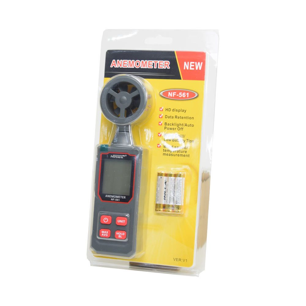 Noyafa NF-561 цифровий анемометр для вимірювання швидкості вітру та температури повітря. Діапазон швидкості від 0,3 до 30 м/с з підтримкою п’яти одиниць вимірювання. Відображає поточні, максимальні, мінімальні та середні значення. Оснащений функцією wind chill і підсвічуванням дисплея. Працює від трьох батарейок AAA.