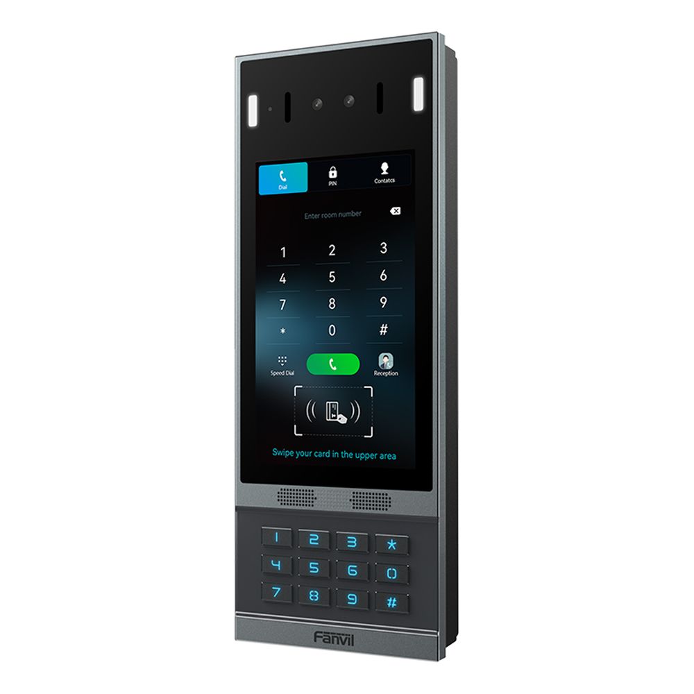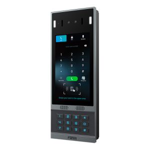 Fanvil i67 – інтелектуальна, багатоабонентська IP виклична панель із розпізнаванням облич і великим 7-дюймовим сенсорним екраном для сучасних житлових комплексів, офісів і готелів. Модель оснащена двома 2-мегапіксельними камерами з автоматичним підсвічуванням, що забезпечує чітке відеоспостереження навіть за низької освітленості. Міцний корпус з алюмінієвого сплаву з класом захисту IP66 і IK07 розрахований на роботу в складних умовах. Для доступу доступні розпізнавання обличчя, карта, PIN-код, QR-код і віддалена команда через DTMF. Домофон підтримує зберігання до 10 000 облич і 10 000 карт, а інтеграція з сучасними системами безпеки здійснюється за протоколами SIP і ONVIF. Пристрій простий в установці і оснащений розширеними можливостями підключення зовнішніх пристроїв.