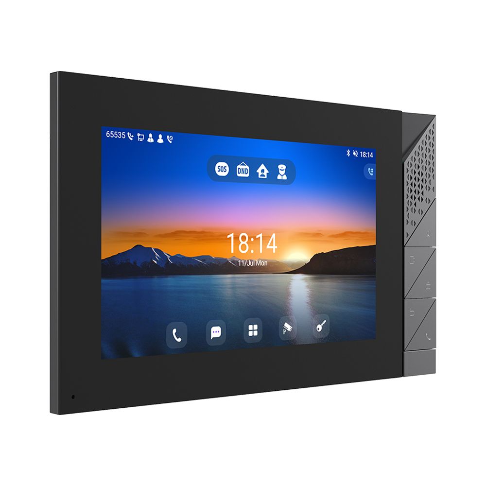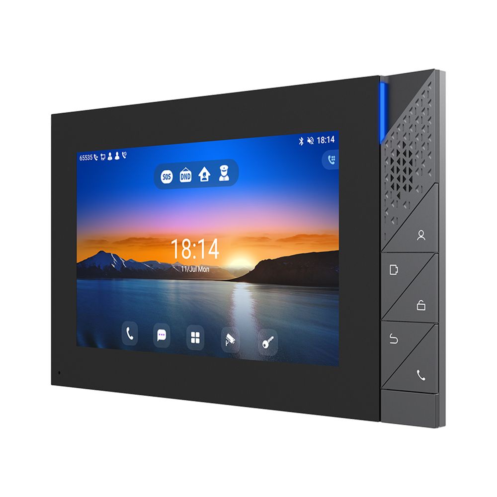 Fanvil i55A – внутрішній IP-відеодомофон з 7-дюймовим сенсорним екраном і операційною системою Android 9.0. Модель оснащена п'ятьма фізичними клавішами, вісьмома входами тривоги та двома релейними виходами для комплексної інтеграції в системи безпеки. Пристрій підтримує відеодзвінки з роздільною здатністю до 1080p і перегляд потоку з відеопанелей. Голосовий зв'язок реалізований через подвійні динаміки потужністю 1,5 Вт з ехо- і шумозаглушенням. Вбудовані Bluetooth 5.0 і Wi-Fi 2.4/5 ГГц. Живлення можливе через PoE або адаптер 12В (купується окремо), корпус виконаний з ABS і алюмінієвого сплаву, установка настінна.