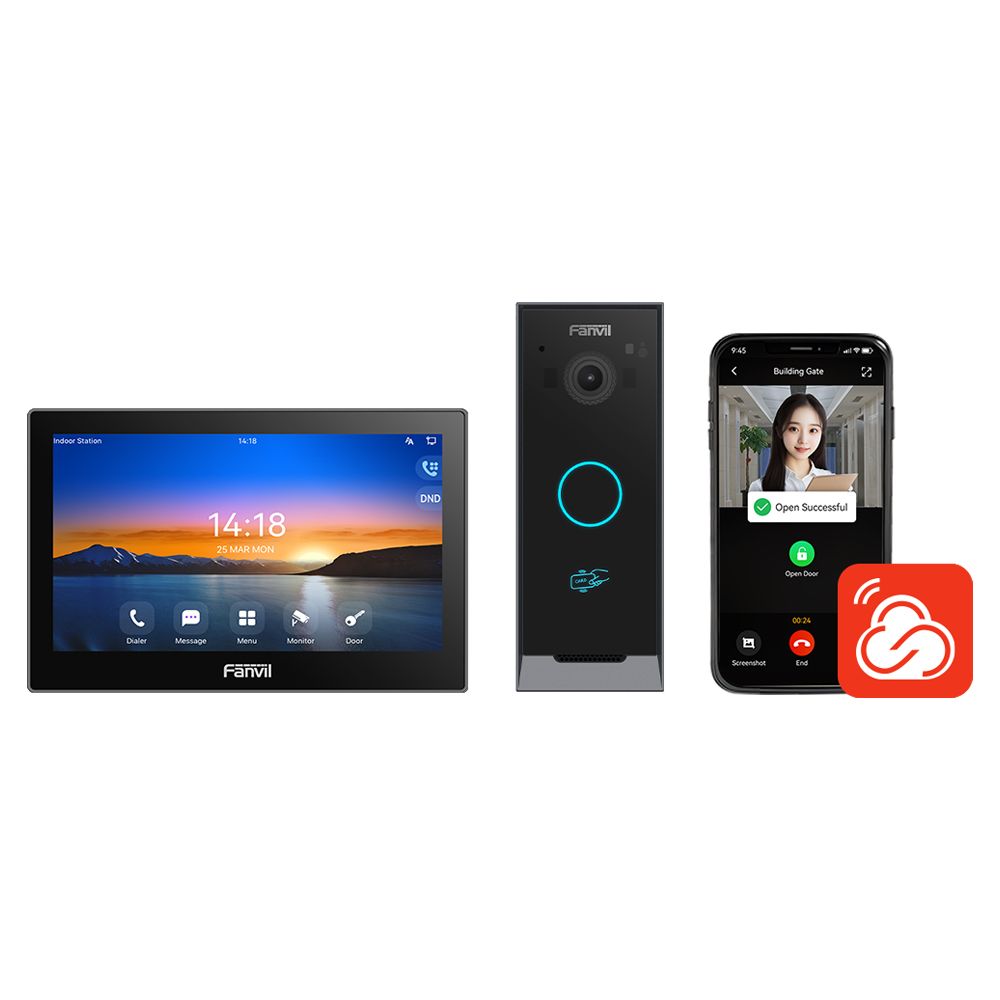 Fanvil VIK-01 — комплект IP-відеодомофона для організації відеозв’язку та контролю доступу в приватних будинках і невеликих об’єктах. Система складається з внутрішнього 7-дюймового сенсорного монітора Fanvil i504W та викличної панелі Fanvil i60 з камерою 2 Мп і кутом огляду 140°. Підтримуються HD-відеодзвінки, дистанційне відкриття дверей через мобільний застосунок Fanvil Link і підключення через Ethernet або Wi-Fi 2.4/5 ГГц. Виклична панель оснащена інфрачервоним підсвічуванням і підтримує відкриття дверей за допомогою карти доступу Mifare, DTMF-коду або дистанційного керування доступом. Система працює за протоколом SIP, підтримує PoE-живлення та інтеграцію з IP-камерами через ONVIF.