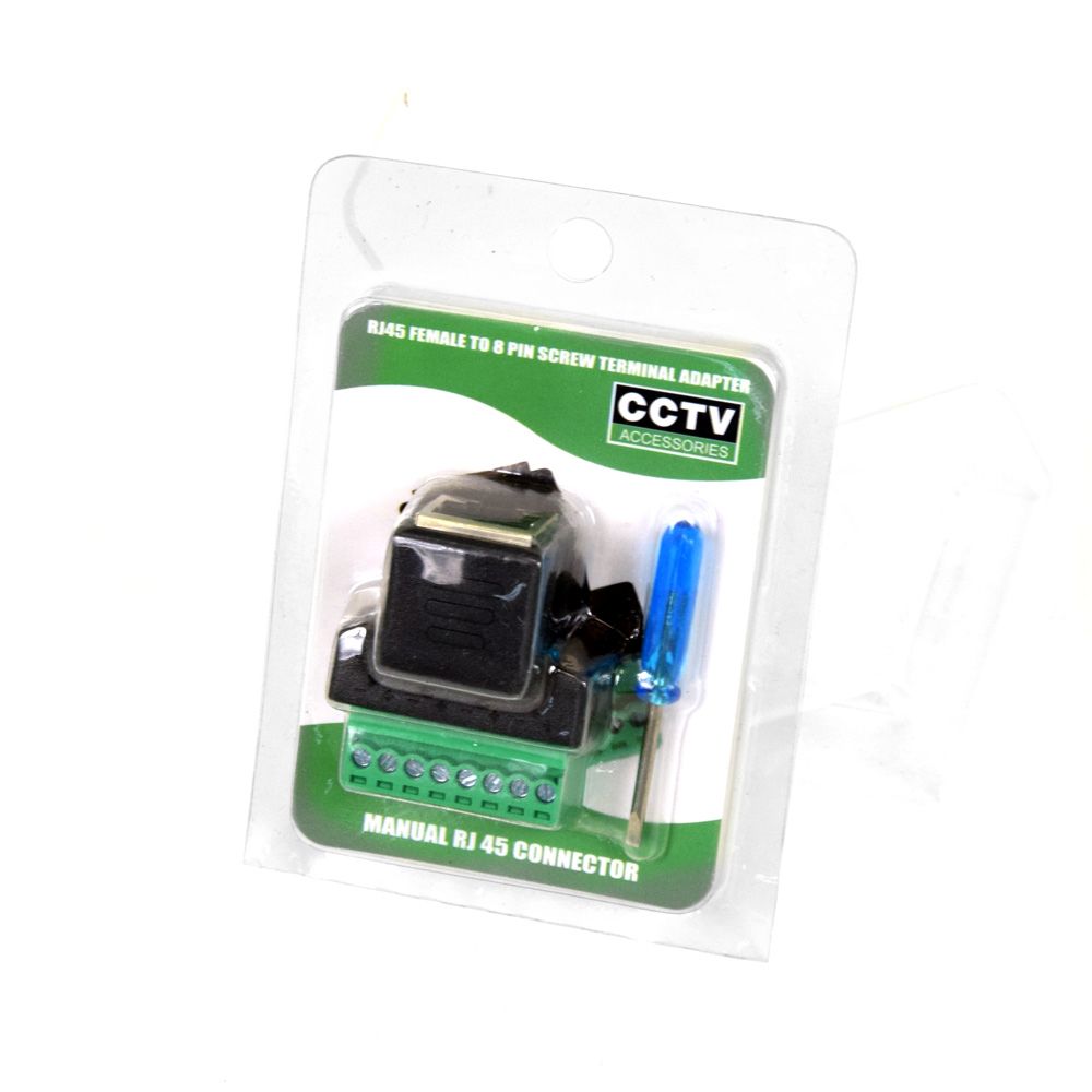 Конектор RJ45 (female) з 8-контактною гвинтовою клемою призначений для під'єднання кабелів UTP до цифрових відеореєстраторів. Виконаний з міцного пластику з металевими контактами, забезпечує надійне з'єднання. Розміри адаптера становлять 42x35x20 мм, колір корпусу — чорний із зеленим.