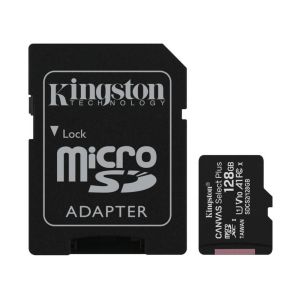 Карта пам'яті microSDXC Kingston 128GB Canvas Select Plus для смартфонів і планшетів. Ємність: 128 ГБ. Швидкість обміну: до 100 МБ/с при читанні і не нижче 10 МБ/с при записі, UHS-I Speed Class 1 (U1). Формат: exFAT. Габарити: карта пам'яті: 11 x 15 x 1 мм, SD-адаптер: 24 x 32 x 2.1 мм. Робоча температура: -25°C ~ +85°C. Напруга живлення: 3.3 В