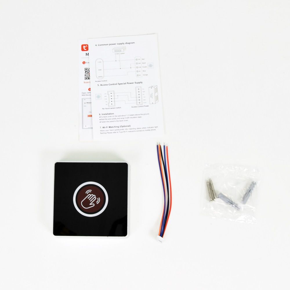 Кнопка виходу ATIS Exit-KT з підтримкою Tuya Smart для контролю доступу. Безконтактний спосіб використання. Інтегрується з екосистемою Tuya Smart. Тип встановлення: накладний. Лінійні виходи: NO/NC/COM. Відстань детекції: 5-15 см (регулюється). Живлення: DC 12 В. Функціональні особливості: підсвічування кнопок. Матеріал корпусу: ABS + Acrylic. Розміри: 86 x 86 x 20 мм. Встановлення у приміщенні.