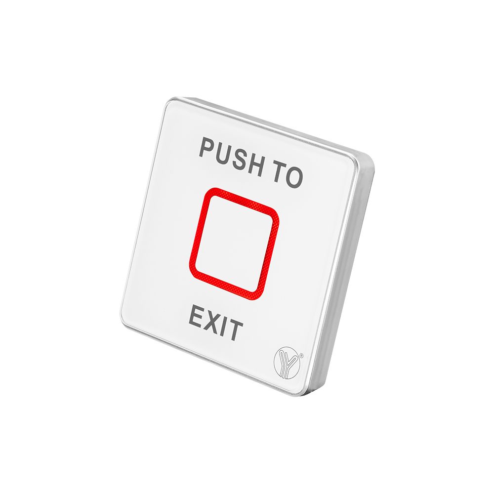 Кнопка виходу сенсорна контактна, накладна, NO/NC/COM, корпус покритий загартованим склом, діодна індикація стану кнопки виходу, DC12-24V, струм споживання: 60mA, очікування - червоний, спрацювання - зелений, 86 х 86 х 12 мм.